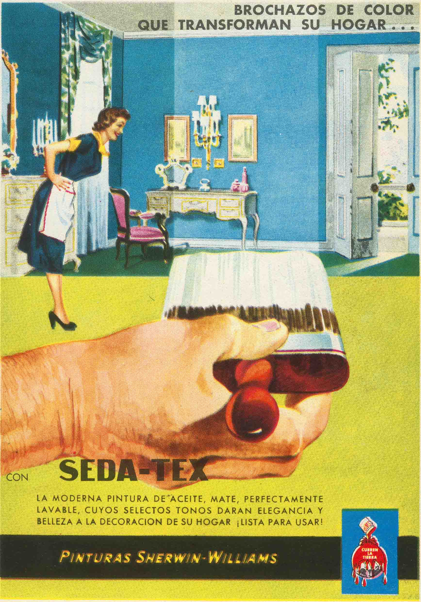 La aparición de las pinturas lavables en el entorno del hogar supuso un cambio profundo en la simplificación y modernización de la vieja casa oscura, empapelada y de estilo castellano. Los anuncios reflejan de forma colorista el cambio.