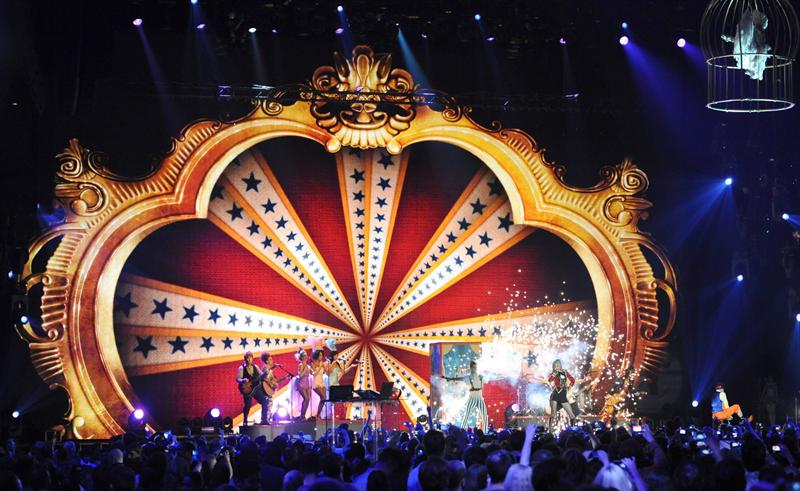 Vista del escenario, mientras actúa Taylor Swift. La norteamericana y Justin Bieber fueron los grandes ganadores de la noche. Ella fue galardona con el EMA a mejor artista femenina, mejor "look", y mejor directo, y Bieber ganó el premio a mejor artista masculino, mejor "world stage" y mejor álbum de música pop.