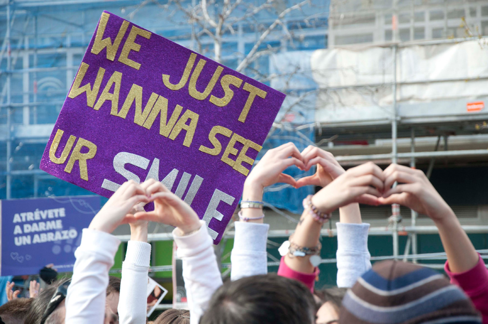 Corazones, formados con las manos de algunos de los fans, a la espera de la apertura de puertas