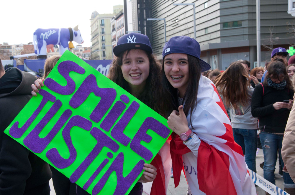 Dos fans, con una pancarta en la que se puede leer "Justin sonríe"