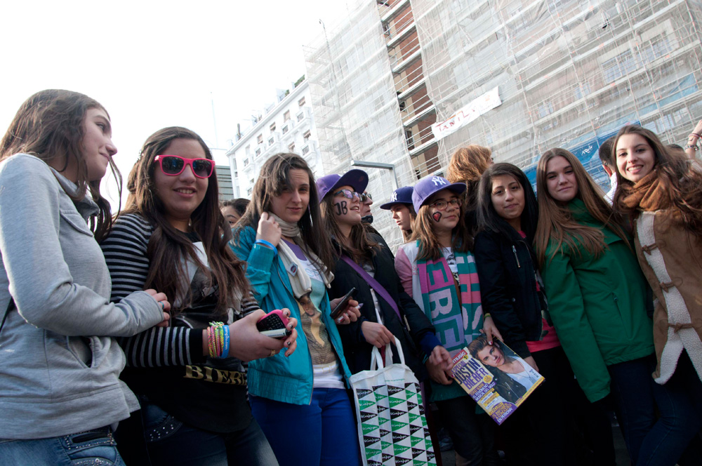 Un grupo de fans, ataviadas con gorras y gafas al estilo Justin Bieber. Una de ellas portando una revista con la foto de su ídolo musical