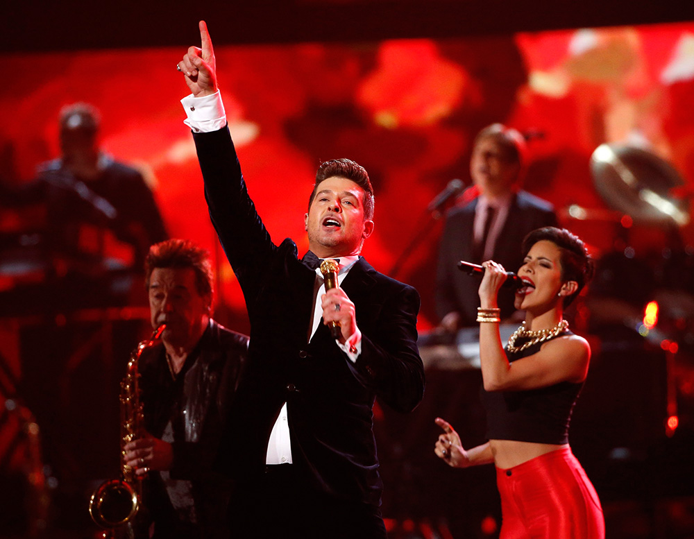 Robin Thicke, esta vez sin Miley Cyrus, hizo vibrar a todos en la fiesta pre-Grammy a ritmo de Blurred Lines.
