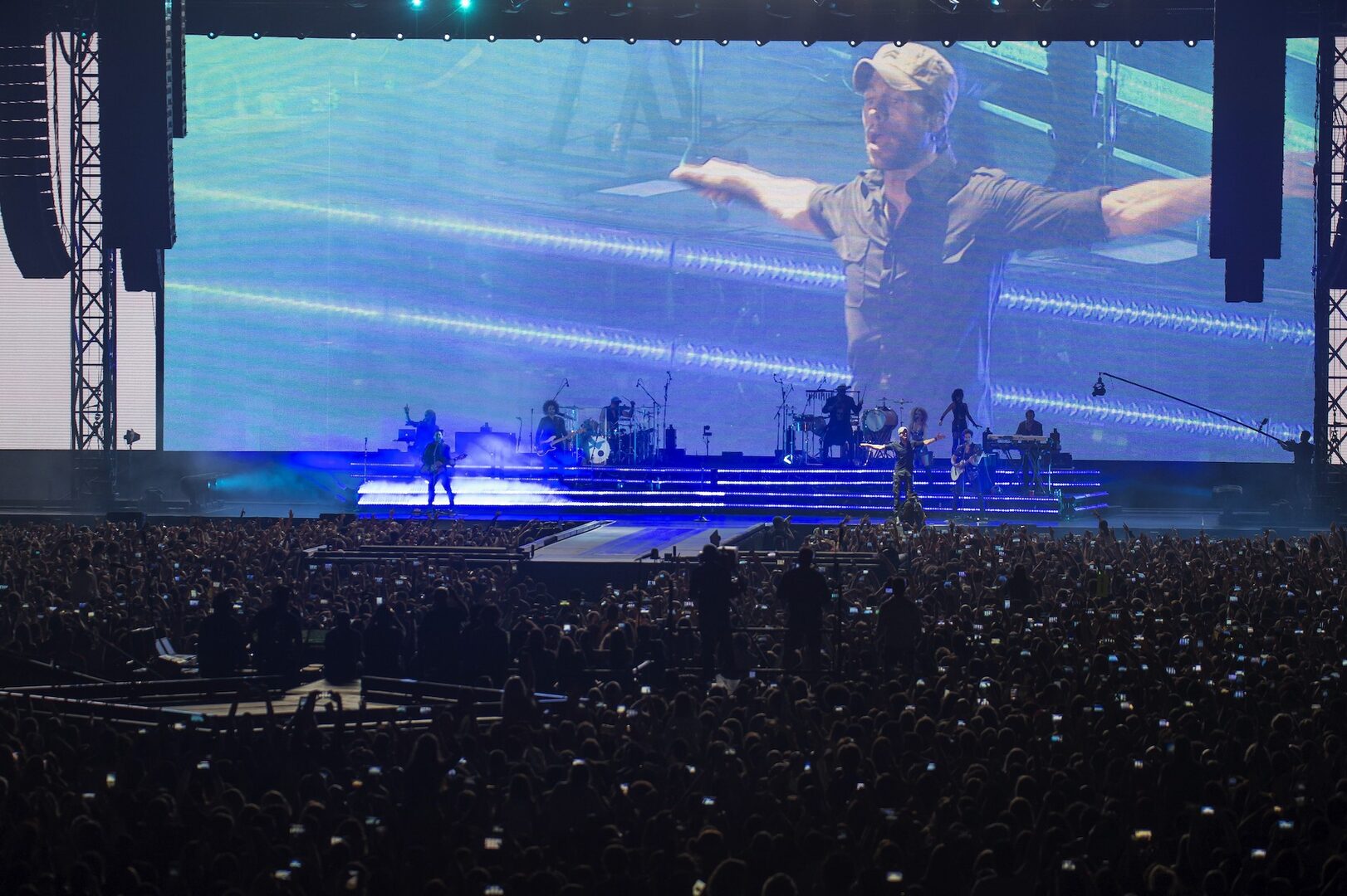 Una gran pantalla de cientos de metros cuadrados, en la que se proyectaba la imagen del artista por la escena y distintos juegos de color, cerraba el escenario, sobre el que Enrique Iglesias estaba acompañado por siete músicos y dos cantantes femeninas en los coros, que le hicieron de partenaire en todas las canciones.