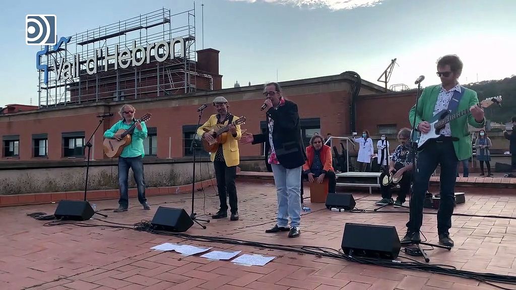 El grupo de rumba catalana Los Manolos han realizado este jueves un concierto en la azotea del Hospital de la Vall d'Hebron de Barcelona para homenajear al personal sanitario por Sant Jordi.