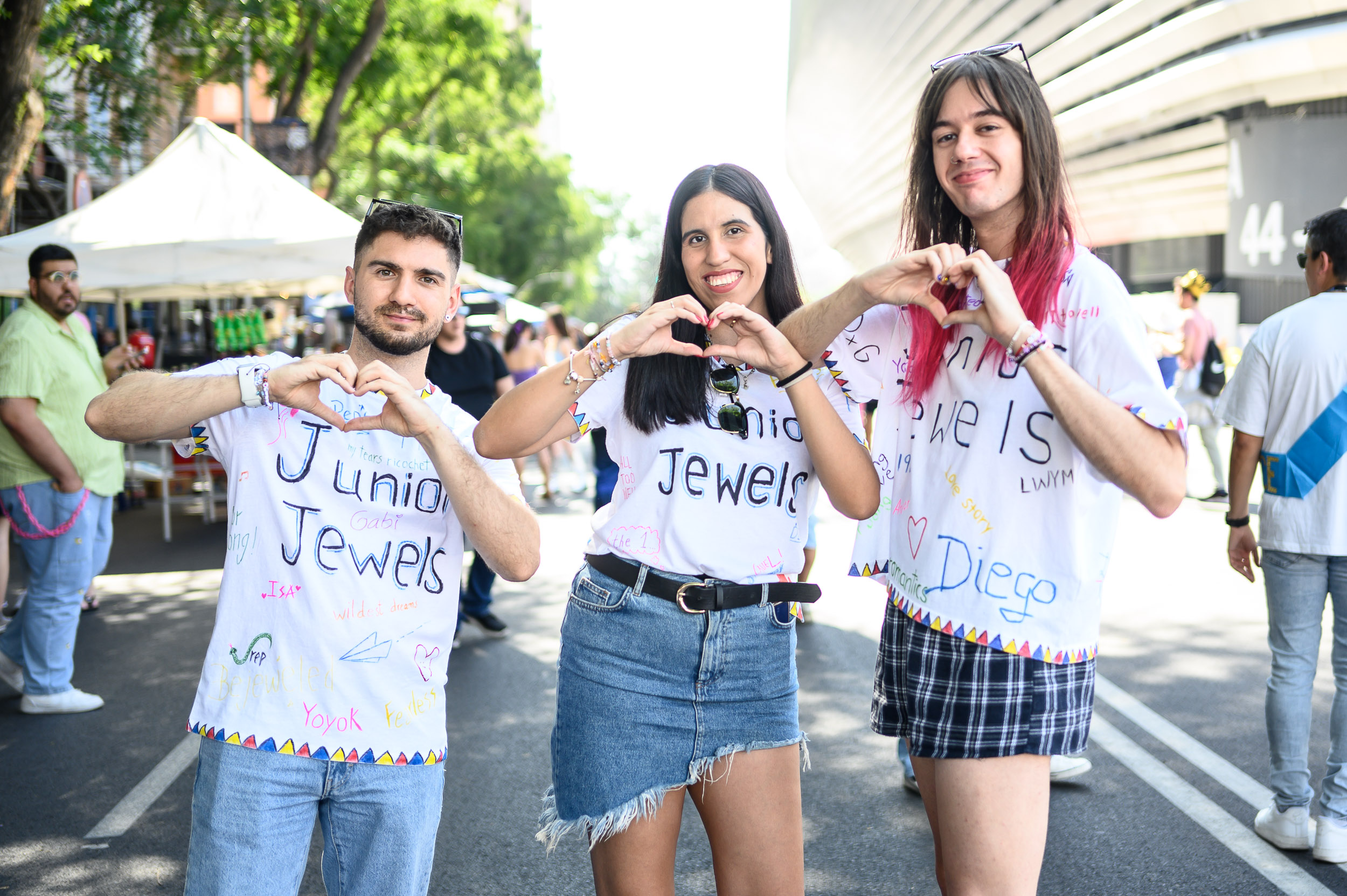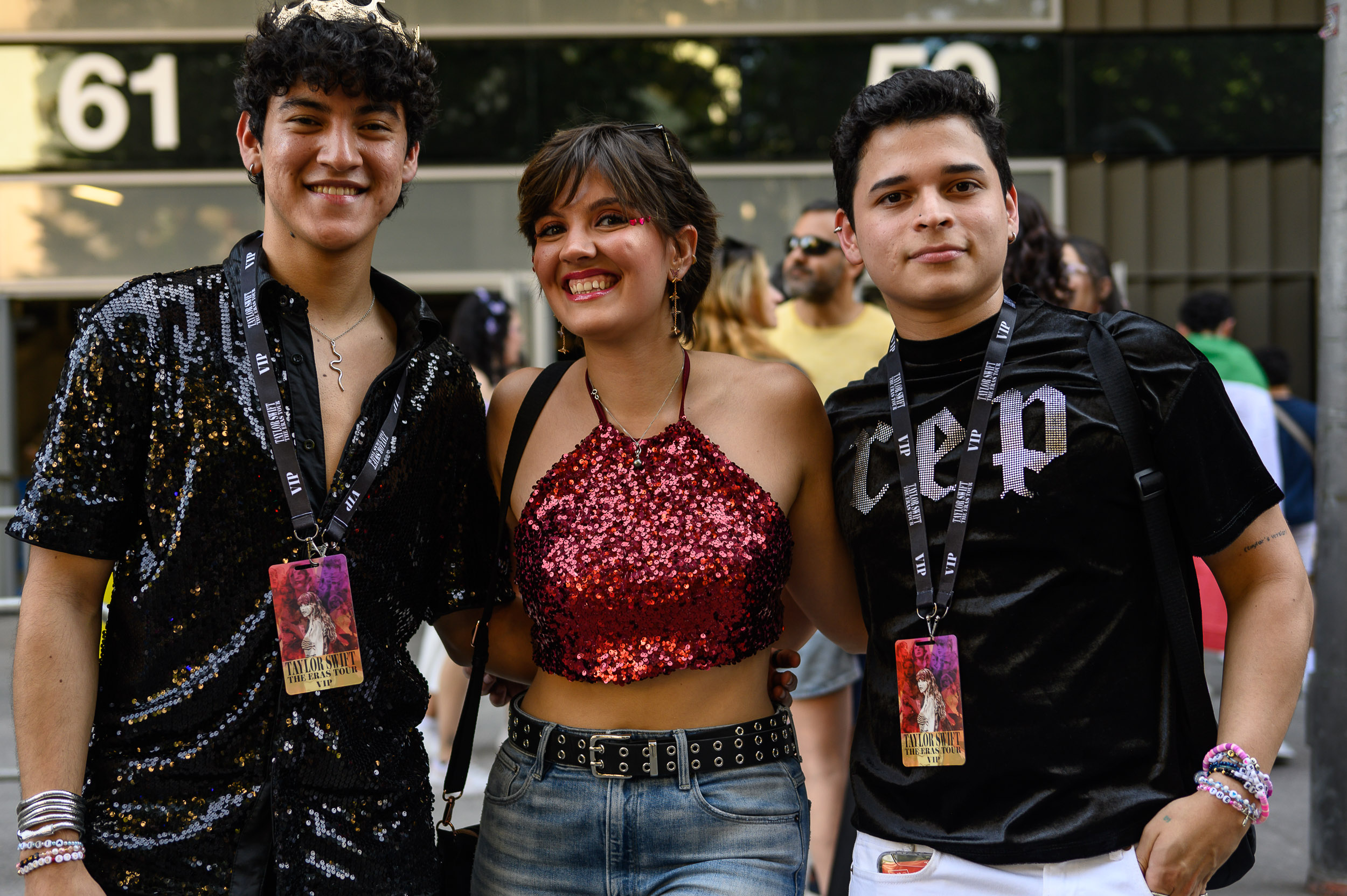 Tres amigos posando con el mismo gesto que popularizó Taylor Swift entre sus fans en una gira anterior.