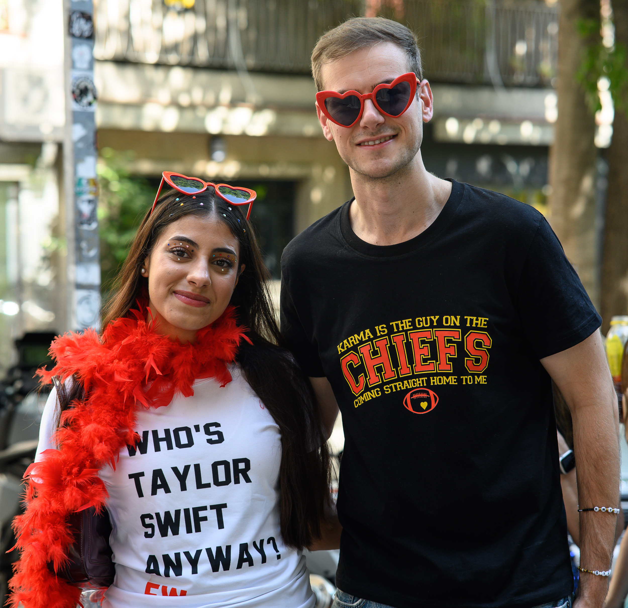 Una pareja, en este caso el chico lleva una camiseta con un verso de la canción Karma que la diva cambia para que sea sobre su nueva pareja.