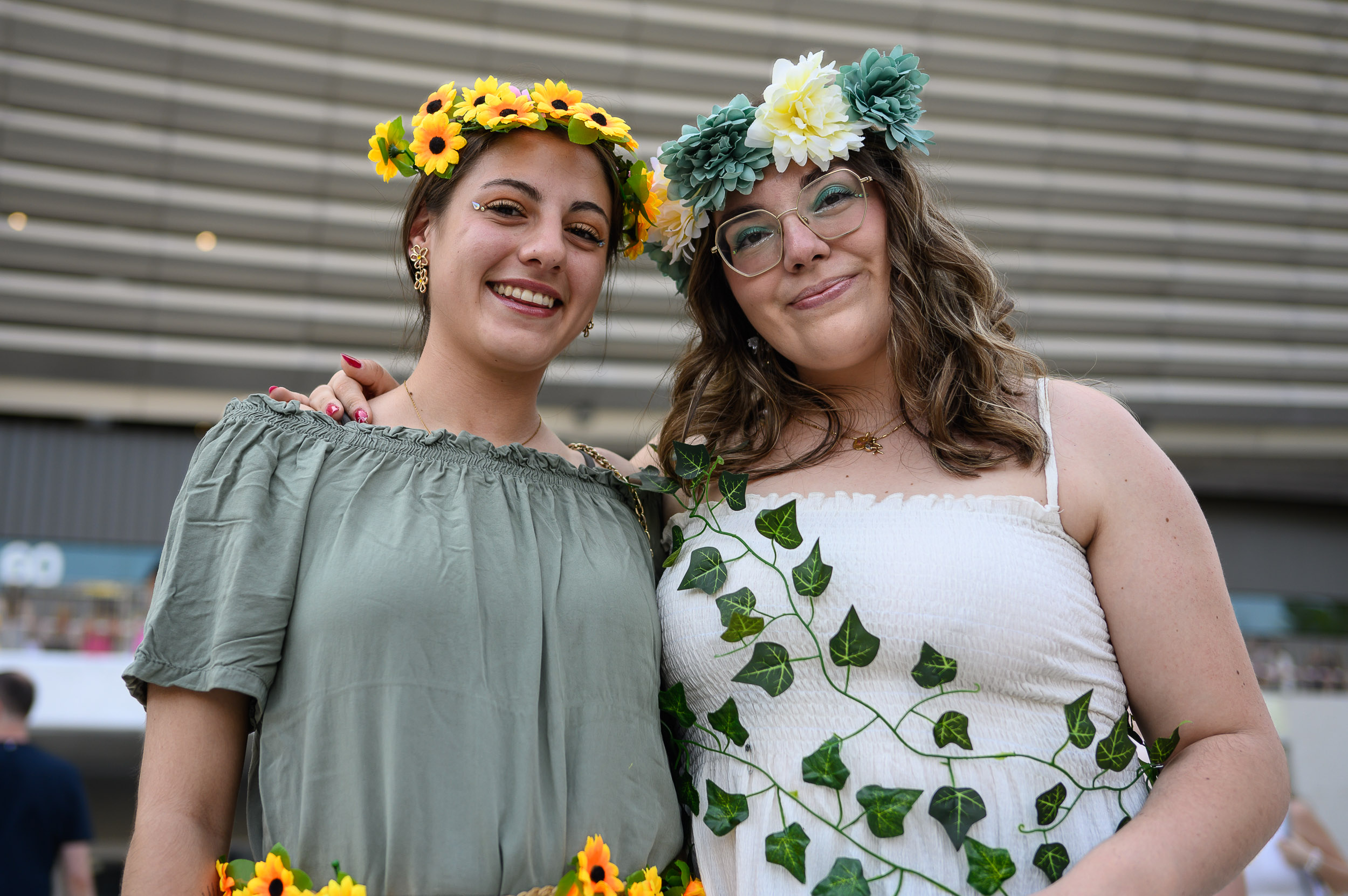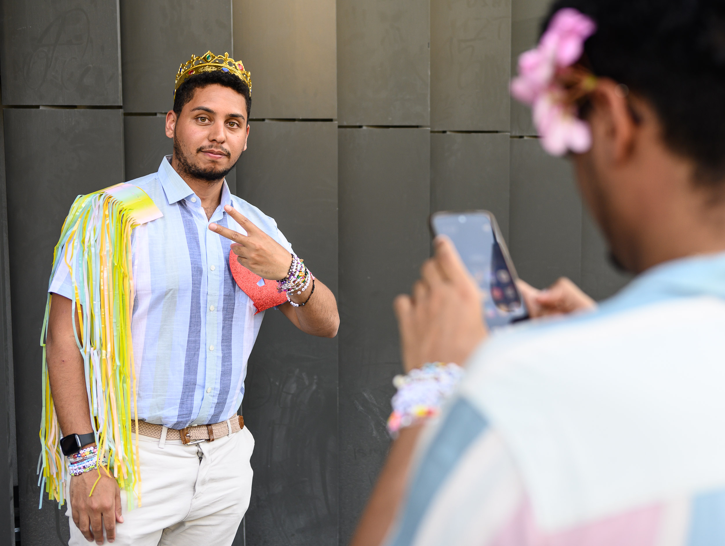 Un chico con una flor en la cabeza le hace una foto a su amigo que va de Heartbreak Prince, un personaje de la canción Miss Americana & the Herartbreak Prince.