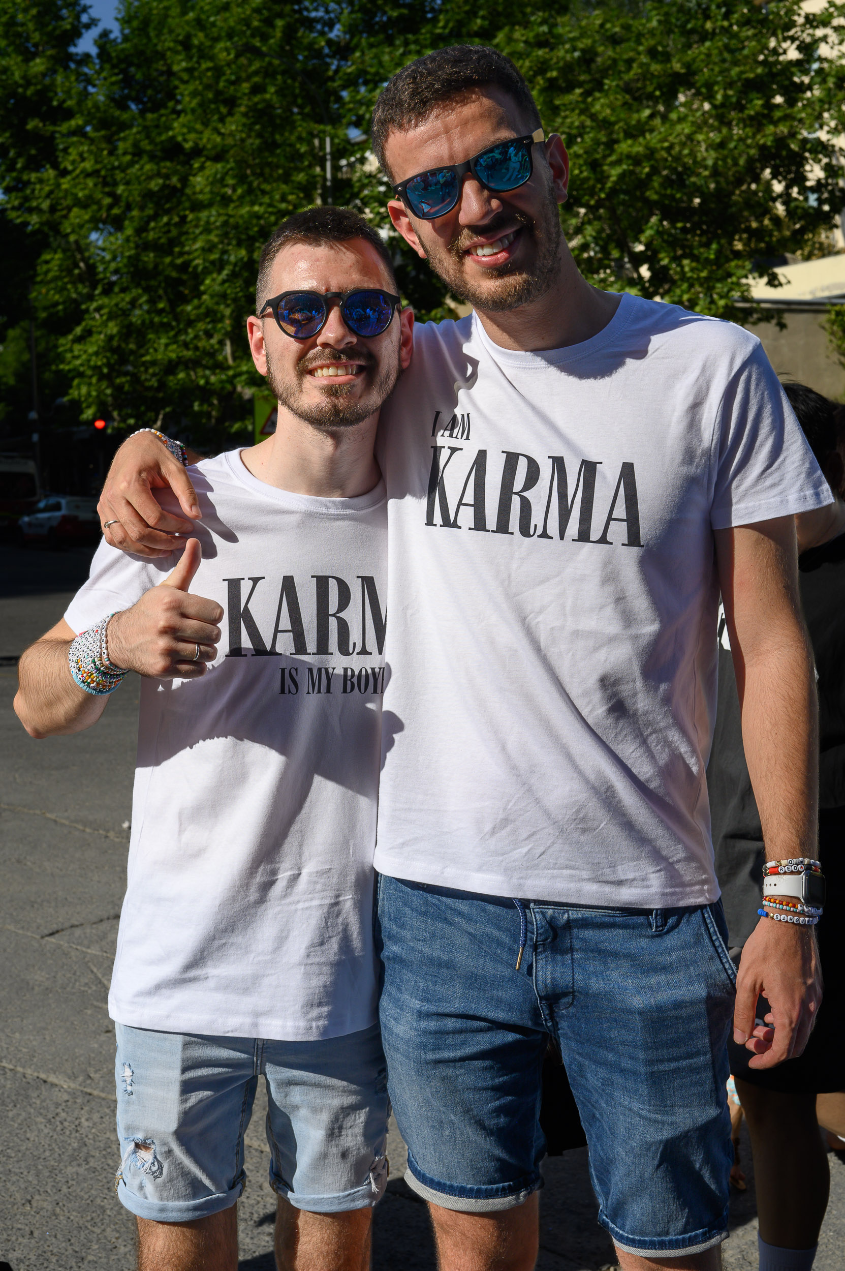 El chico de la izquierda lleva en su camiseta la frase "Karma is my boyfriend", un verso de Karma. El de la derecha dice: "Soy Karma".