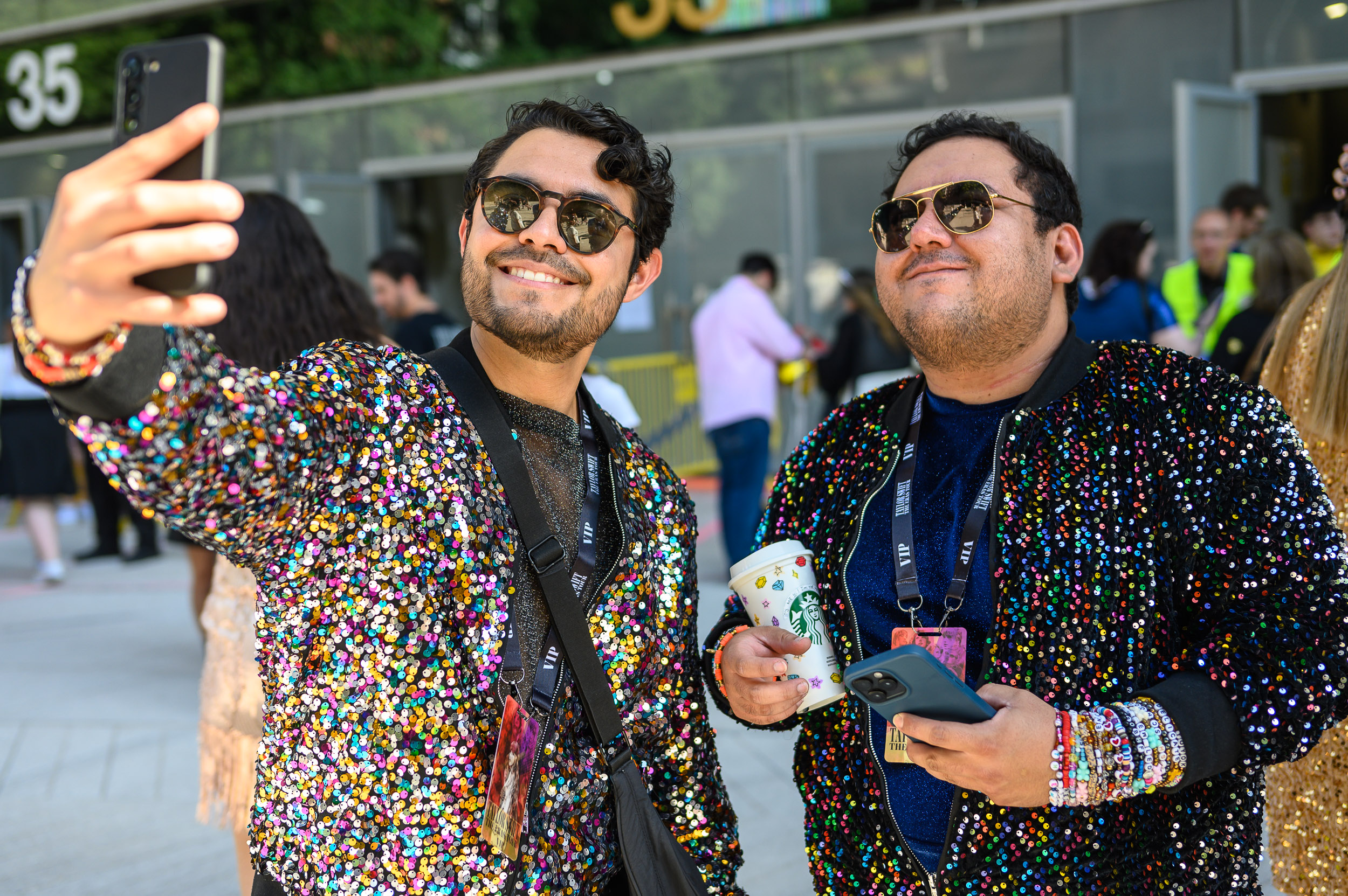 Dos chicos se hacen un selfi con un look de la canción Bejeweled, del disco Midnight.