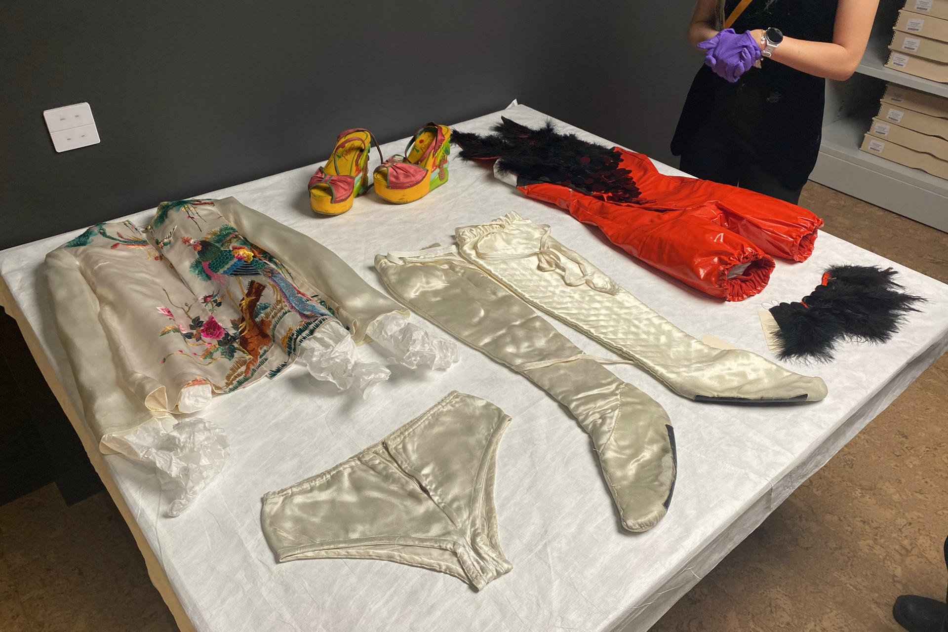 Además de los proyectos y documentos, el centro expone una selección de los trajes más emblemáticos del artista, incluyendo creaciones de Freddie Burretti, el diseñador de Ziggy Stardust; conjuntos del álbum Heathen diseñados por Agnès b; y el traje de boda de Thierry Mugler que Bowie vistió en 1992.