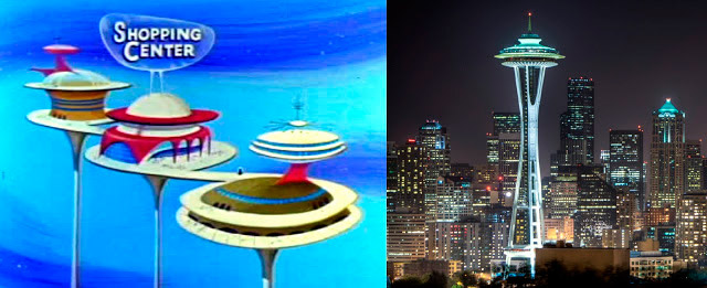Los diseños espaciales de Los Supersónicos son atómicos. La estética de los edificios suspendidos en el espacio tienen gran similitud con la Aguja Espacial de Seattle diseñada por el arquitecto Edward E. Carlson en 1962, inspirada en la torre de Stuttgart (Alemania). En lo alto tiene un restaurante giratorio que tarda 47 minutos en girar los 360 grados.(Ver vídeo del restaurante giratorio)