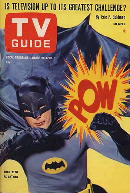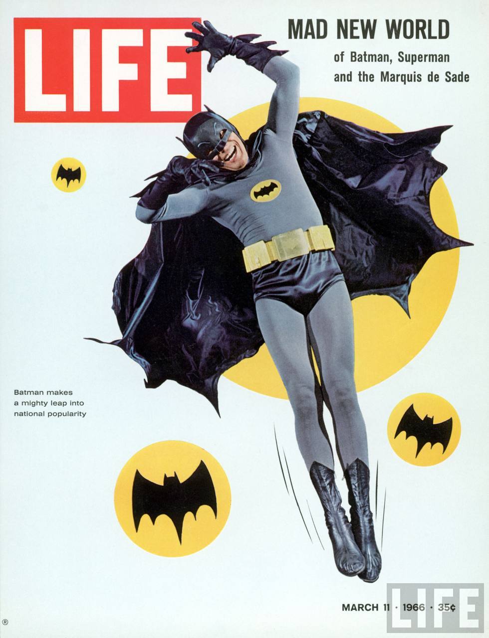 El hombre murciélago Adam West, con el disfraz de Batman, ocupó numerosas portadas de revistas tan prestigiosos como LIFE, con su divertido traje de punto y su máscara y capa de brillante satén. (Ver vídeo de Batman y Batgirl)