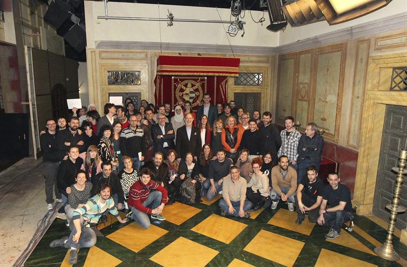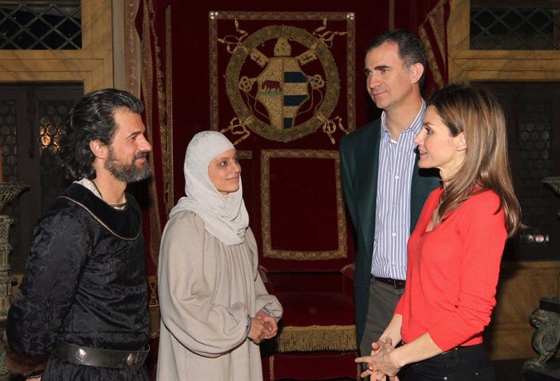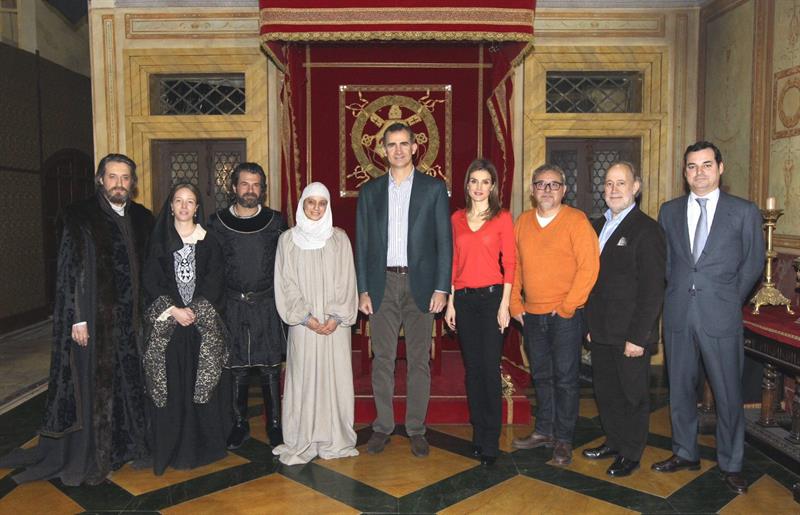 Los Príncipes de Asturias,Felipe y Letizia, junto al presidente de RTVE, Leopoldo González Echenique, y varios actores y otros miembros del equipo de la serie de "Isabel".