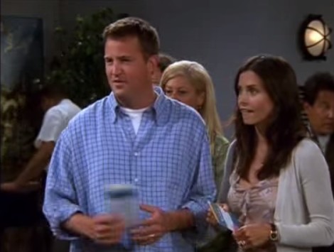 En la escena se ve a Mónica y a Chandler a punto de subir al avión. Los miedos de ambos protagonistas hacen que se metan en serios problemas con los agentes de seguridad. En el fragmento, de cuatro minutos, Chandler hace una gracia después de leer un cartel que pone "prohibido bromear sobre secuestrar o poner bombas en aviones". Los productores decidieron no incluir esta escena en el montaje final que se emitió en la cadena NBC.