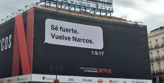 Ahora anuncia el regreso de la serie para el 1 de septiembre recordando uno de los mensajes de textos más famosos de la historia, el SMS de Mariano Rajoy a Luis Bárcenas: "Luis, sé fuerte". Netflix publicita la esperada tercera temporada con un cartel negro en el que se puede leer un SMS diciendo "Sé fuerte. Vuelve Narcos" y la fecha de estrenos de todos los episodios de esta nueva entrega: "1.9.17".