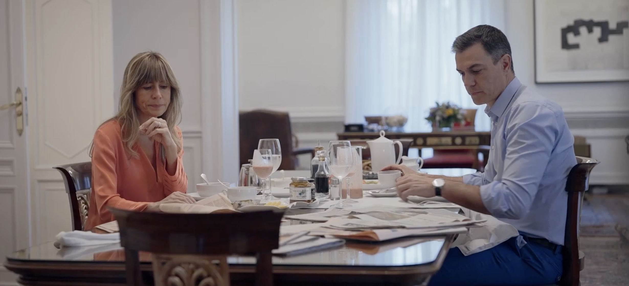 Amanece en el Buckingham de la A-6. "Comentamos lo que vamos a hacer a lo largo del día", dice un Sánchez mañanero. Agendas en común, ya lo sabíamos. La conversación por lo demás es corta y rara. Una pareja que se moja las ganas en el café. Le pregunta Begoña: "¿Qué trae la prensa?" Mientras hace que lee otros periódicos. Le responde: "Mucho Finlandia y Suecia y su ingreso en la OTAN". Begoña suelta: "¡Madre mía!". ¿Madre mía, qué?. A continuación Sánchez, con una carpeta, conduce a dos perros a un pipican vallado. Turquita, también aburrida, se sienta, lo mismo han grabado la escena 15 veces.