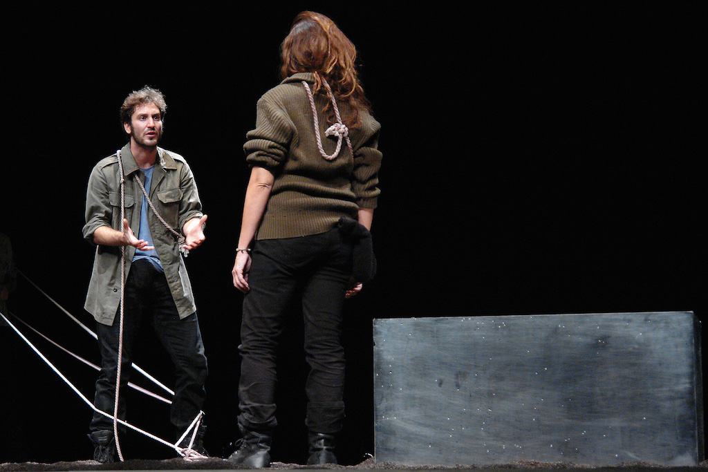 Ésta es, pues, una obra llena de simbolismo. Los personajes están atados unos a otros con una cuerda: los lazos de la ideología. Pero esa idea, opresora, se torna en soga hasta asfixiar la humanidad de los terroristas. El escenario es apenas un montón de tierra y un barreño de agua. Con la tierra se impregnan de valor, con el agua se lavan la culpa. Las dos presentes como metáforas del ideal que defienden.