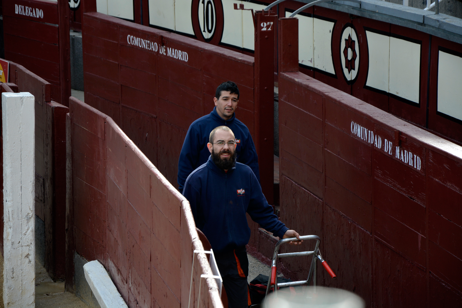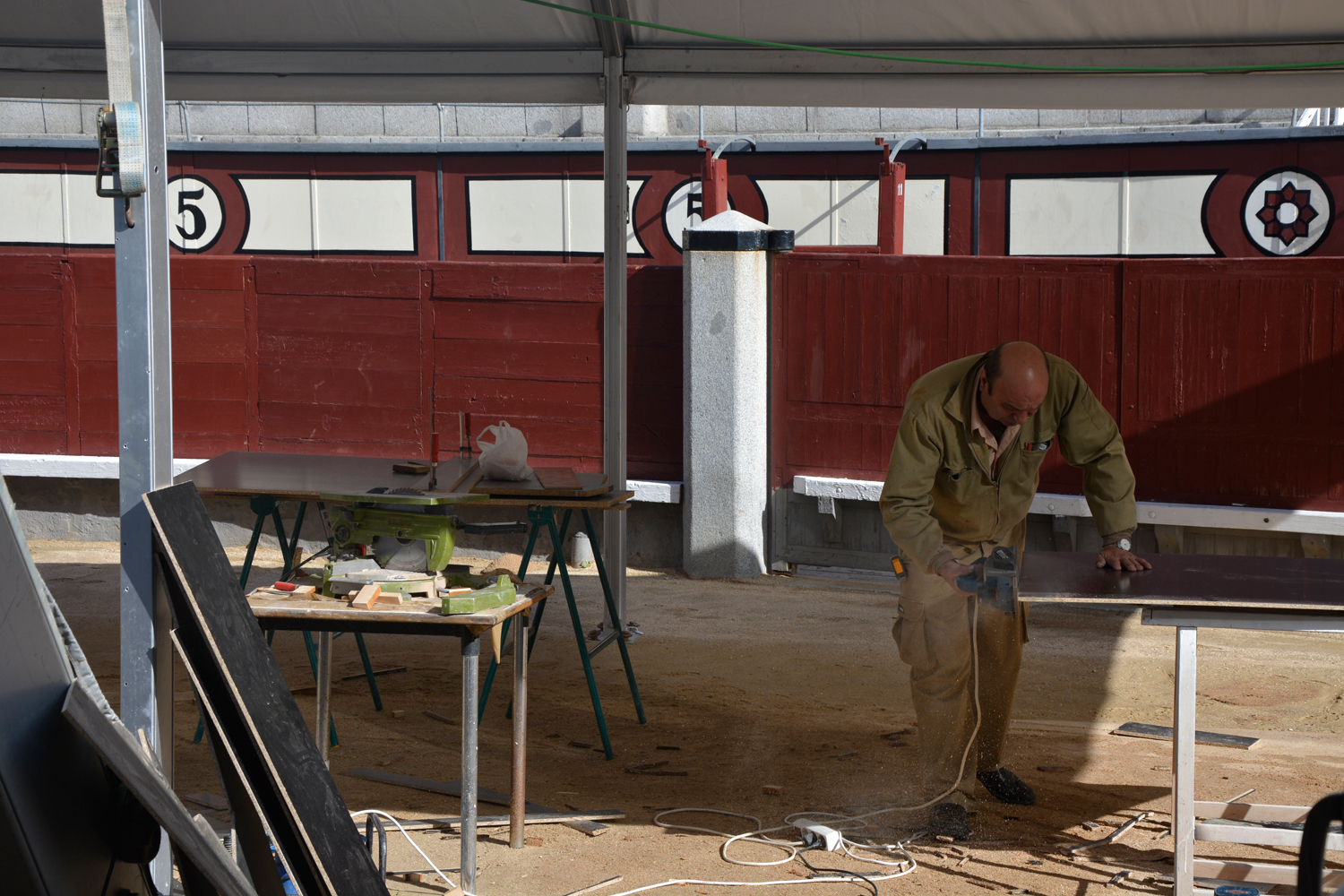 Trabajar en un lugar tan emblemático y simbólico como Las Ventas es un aliciente para cualquier trabajador. En este caso dos operarios que forman parte del equipo que se ha encargado de levantar sobre la arena de la plaza el teatro.