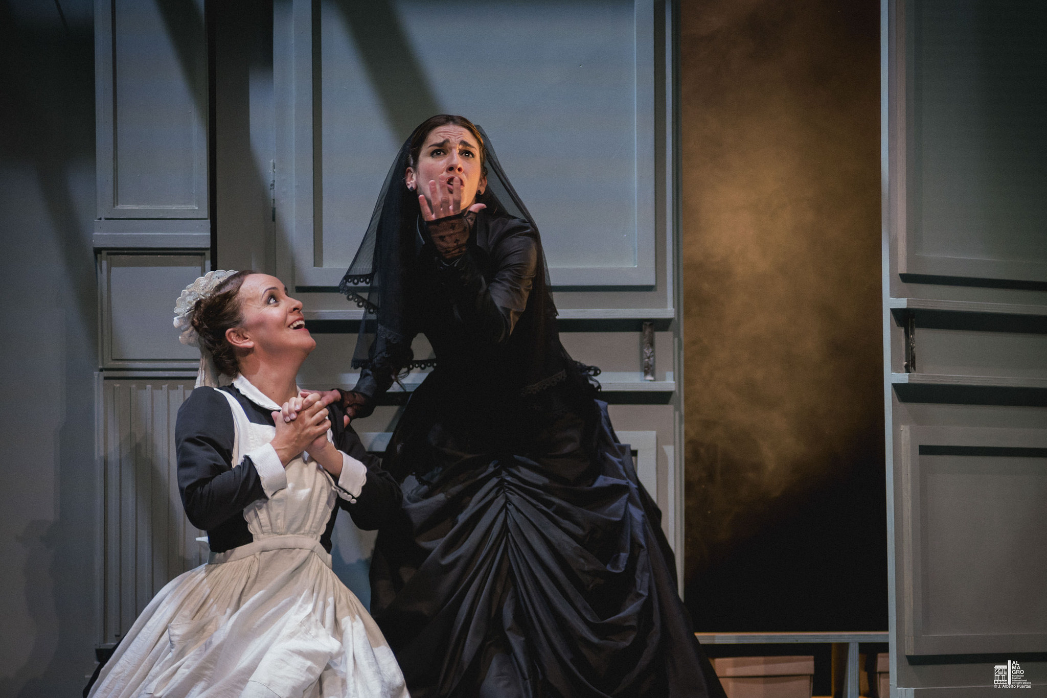 Marta Poveda, de negro, y Cecilia Solaguren como doña Ángela y Isabel en La dama duende