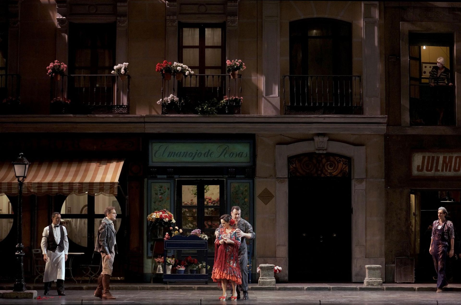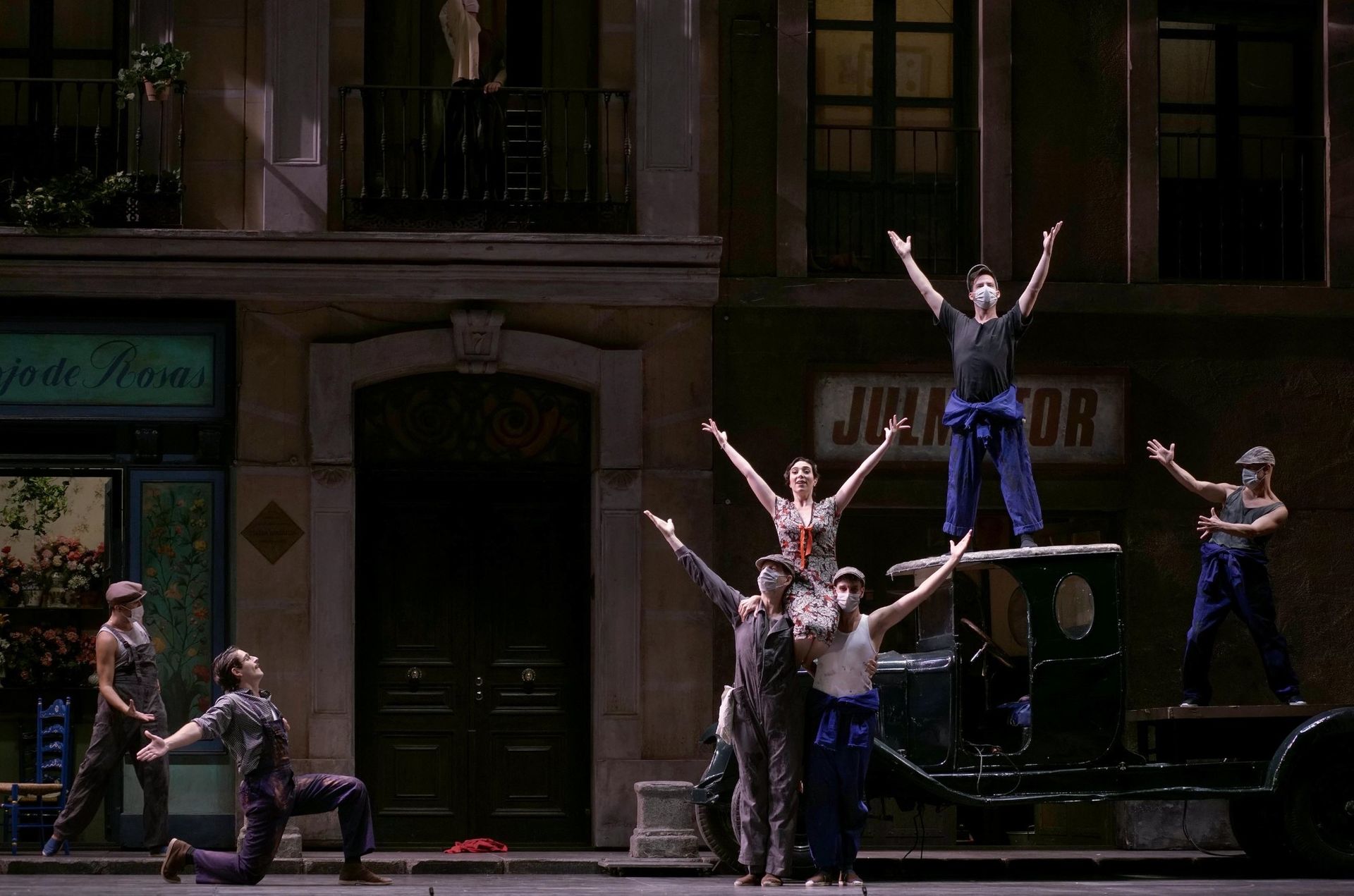 Así pues, en ese choque entre pasado y presente, ficción y pandemia, asoma un libreto que resultó moderno en su día, con sus referencias a clásicos del género, y hoy mantiene algo de frescura gracias a una dirección escénica, la de Emilio Sagi, que acentúa el carácter de los personajes femeninos frente a los engolados, babeantes y caricaturescos masculinos. Sigue habiendo piropos y miradas impúdicas, pero por una vez son contestadas con rostros desafiantes, bofetadas, envites. En la línea de otras grandes mujeres del género, Ascensión, la trabajadora de la floristería El manojo de rosas, ha recibido una esmerada educación, digna de una clase alta, pero desdeña el interés de un aviador para fijarse en un mecánico, Joaquín, obrero como ella. De forma paralela, Clarita, ejemplo de la mujer liberada de la época y repleta de inquietudes, juega con los sentimientos de otro de los mecánicos, Capó.