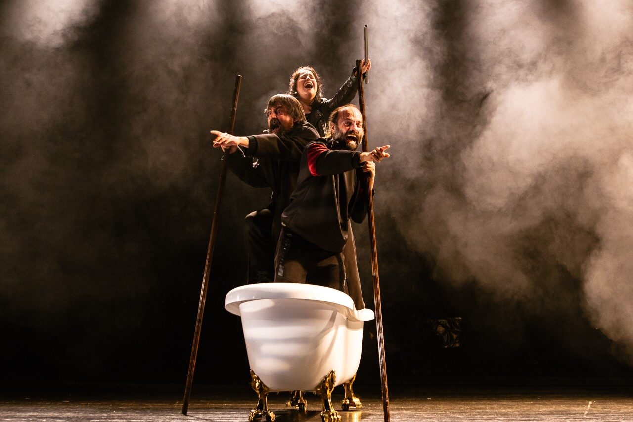 "Queríamos humanizar la conquista. No la planteamos como algo heroico ni la denostamos", señala el director de Conquistadores, Pedro Luis López Bellot, que ha concebido una puesta en escena minimalista, con escasos elementos materiales (una bañera victoriana, unas varas) y un espacio casi vacío, sin escenografía. El vestuario es contemporáneo, pero con reminiscencias al de los siglos XV y XVI.