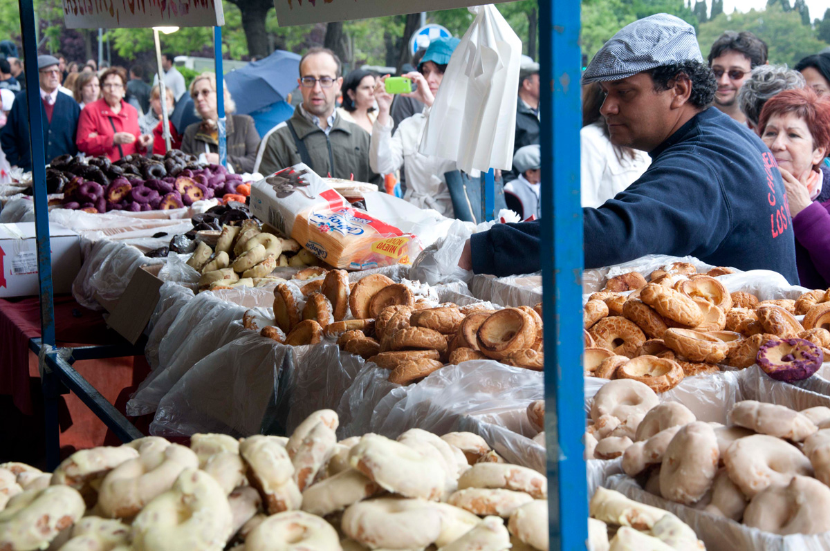 Un hombre selecciona un surtido de las rosquillas típicas del Santo, muy consumidas en San Isidro