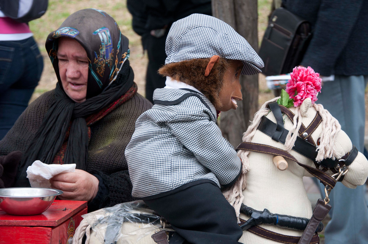 Un peluche de un mono disfrazado de chulapo y montado sobre un caballo adornan el puesto de música de una experimentada artista callejera