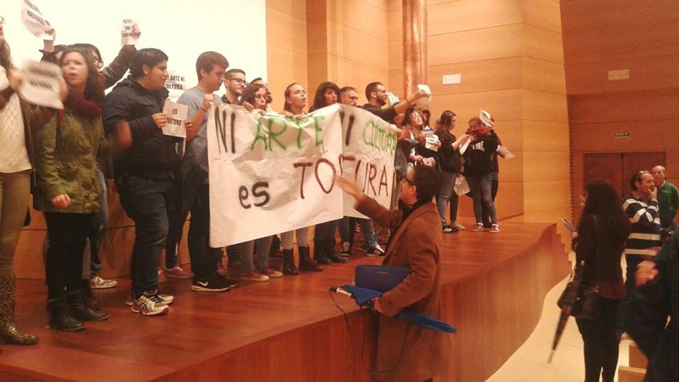 Ni a las siete de la Feria de San Isidro ni a las cinco en punto de Llanto por Ignacio Sánchez Mejías. En el Aula Magna de la Facultad de Filosofía y Letras de la Universidad de Córdoba pasaban unos minutos de las seis y media cuando presentaron a los ponentes de la mesa sobre "La tauromaquia como expresión de libertad": un profesor de Derecho Constitucional, un ganadero, un torero y un publicista. Estaba yo sentado en las primeras filas cuando entre el numeroso público, unas doscientas personas, se levantaron unos cuantos gritando y agitando unos folios: "asesinos" y "torturadores" eran los exabruptos más repetidos. Unos pocos se subieron al estrado y desplegaron una gran pancarta que rezaba "Ni arte ni cultura, es tortura". El proscenio se fue llenando de más y más jóvenes, unos veinte, alguno con la cara tapada en plan kale borroka. Una chica nos saludó a los allí presentes con un contundente y preciso "¡cabrones!". A su lado, otra nos dedicó un taurino desplante en forma de "peineta".