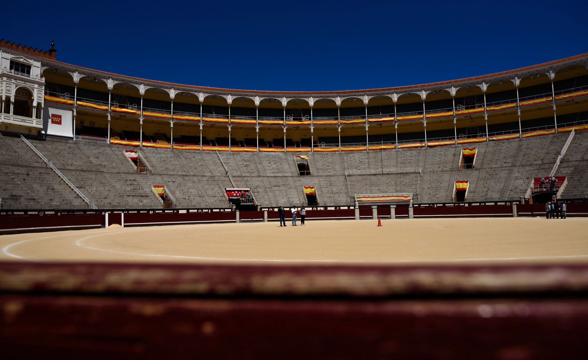 La plaza espera la llegada del público que abarrotará los tendidos. Al fondo en el ruedo, el torero Emilio de Justo y el ganadero Victorino Martín realizan una entrevista para la televisión.