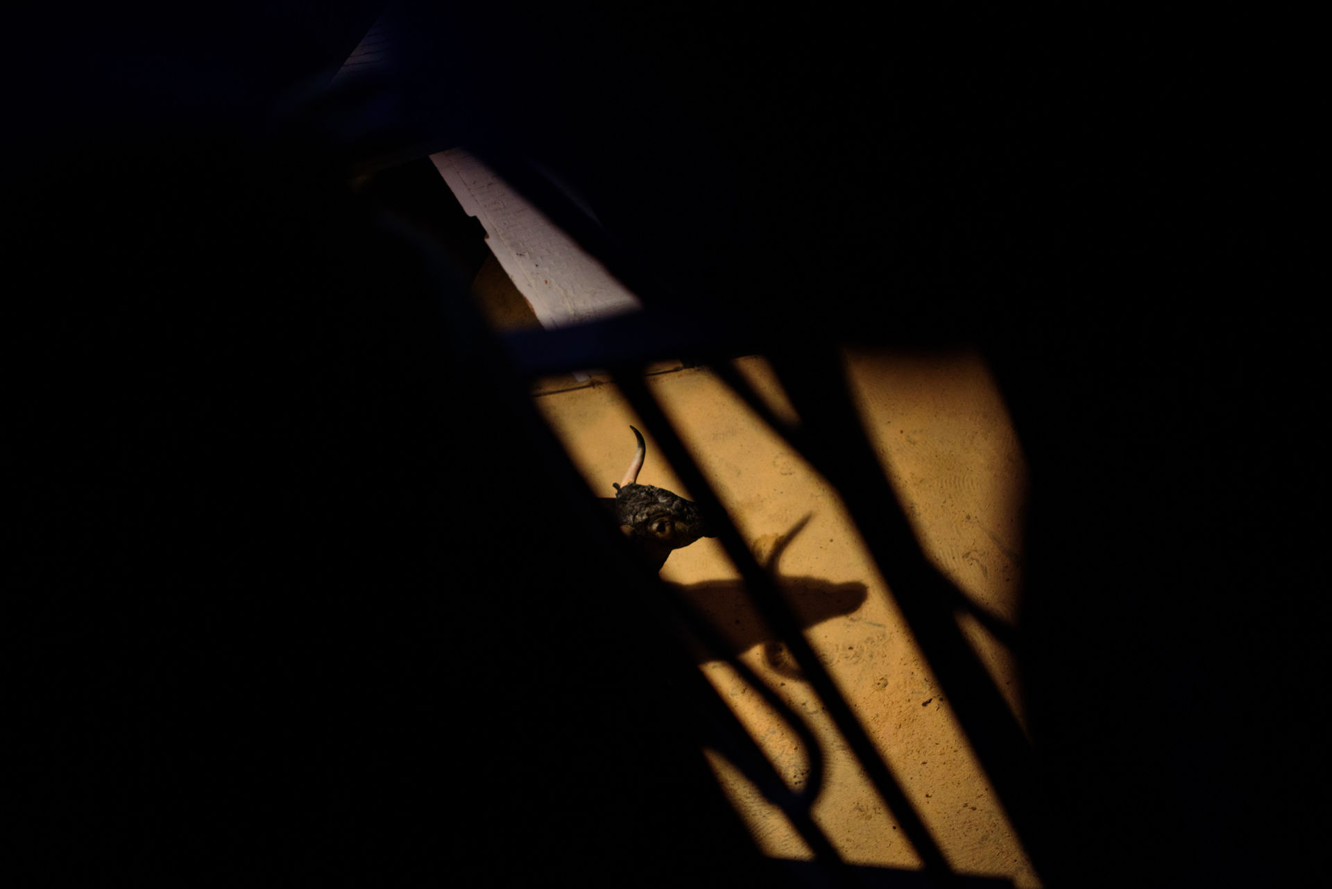 El 'victorino' proyecta la sombra de sus defensas en el suelo del corral.