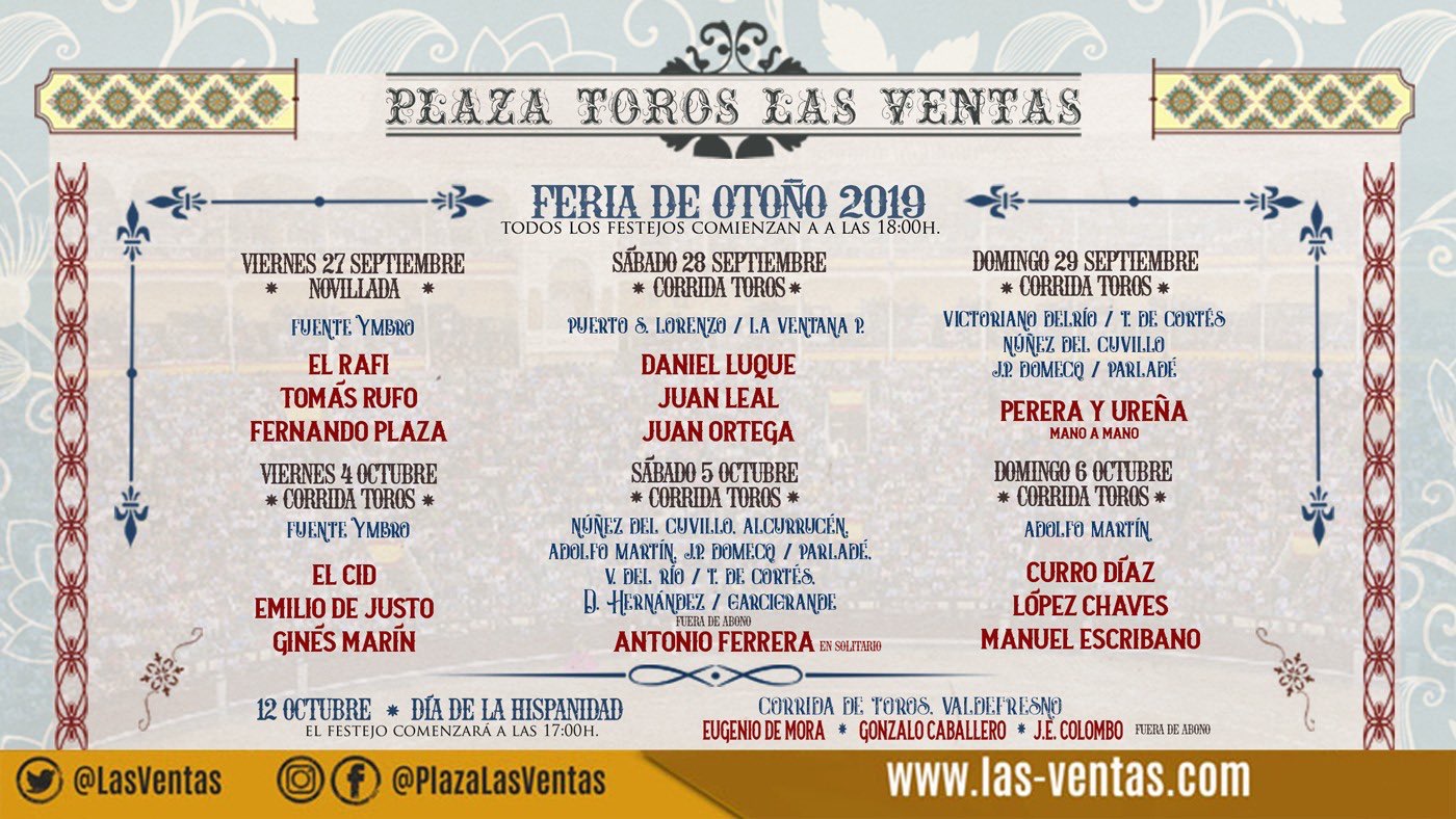 - Domingo, 29 de septiembre. Toros de Victoriano del Río / Toros de Cortés, Núñez del Cuvillo y Juan Pedro Domecq / Parladé para el mano a mano entre Miguel Ángel Perera y Paco Ureña.