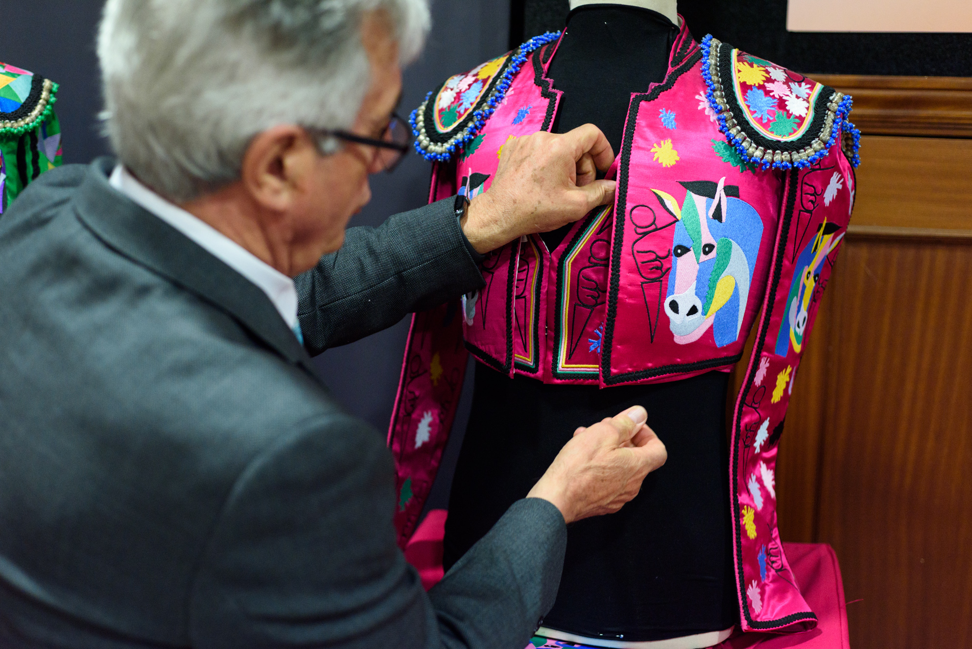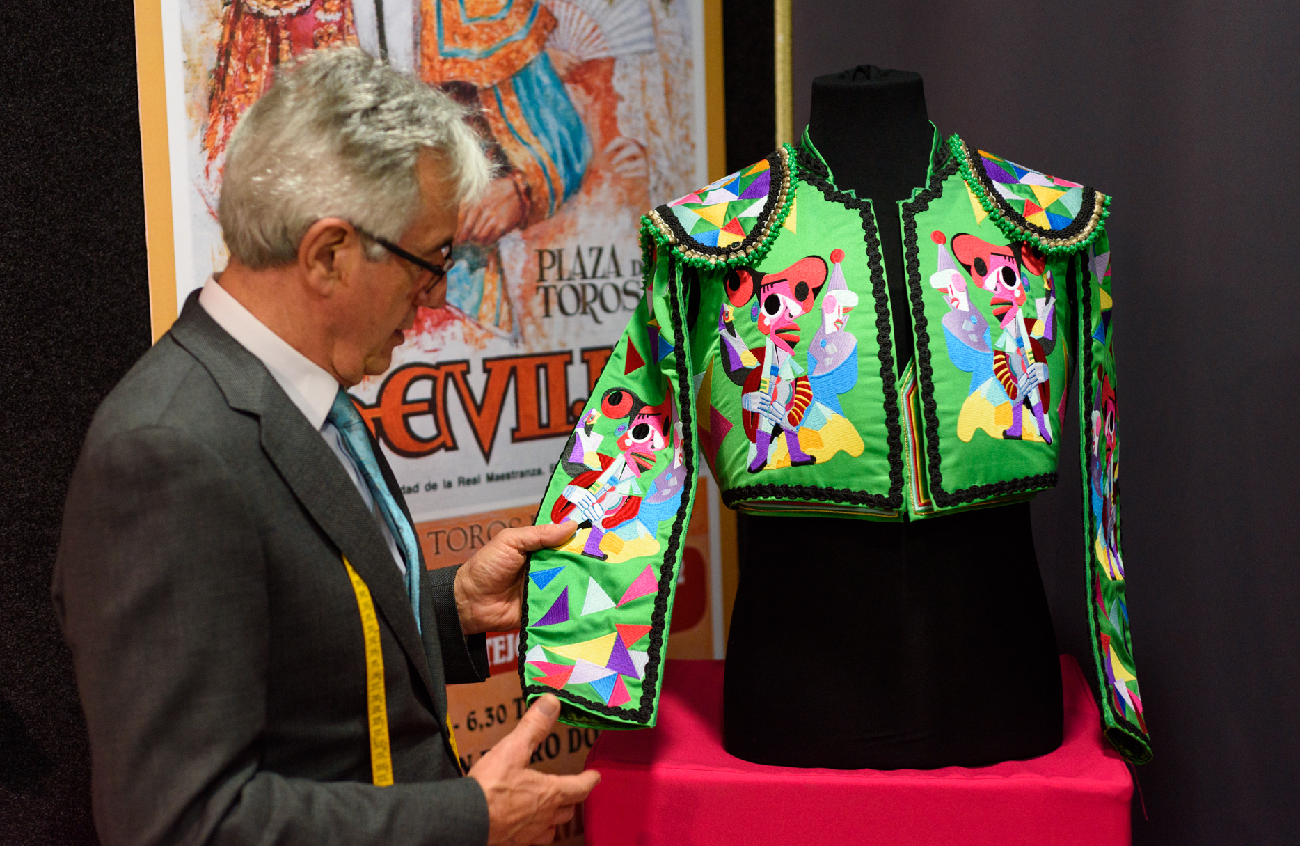 JA: Sí. Retos diarios si es posible. Retos conmigo. Me preguntan muchas veces: ¿y tú cómo andas con la competencia? ¿Qué competencia? Yo la competencia la tengo conmigo mismo, lucho conmigo mismo. A mí ya no me importa el ayer, me importa el presente y muy poco. El futuro sí. Porque el presente en un minuto ya se ha pasado. Estos retos me encantan. Cuando hay toreros valientes, no solamente delante de la cara del toro, sino valientes para llevar ropas que no son comunes, que son ropas diferentes al resto de los vestuarios del mundo. ¿Por qué no vamos a poder hacer cosas distintas? Por aquí tengo unos vestidos picassianos a los que hay que echarle mucho valor. Pero igual que Picasso pintaba a su manera yo lo interpreto dándole mi sentido de sastre y de interpretación y lo que él hacía con pintura yo lo hago con sedas. A mí me gusta hacer innovaciones y como Pablo Picasso aportó muchísimo a la fiesta taurina, ¿por qué no voy a hacer yo una representación de los vestidos en homenaje a ese gran artista y pintor? Ahí están, dice señalando unos vestidos en su exposición.