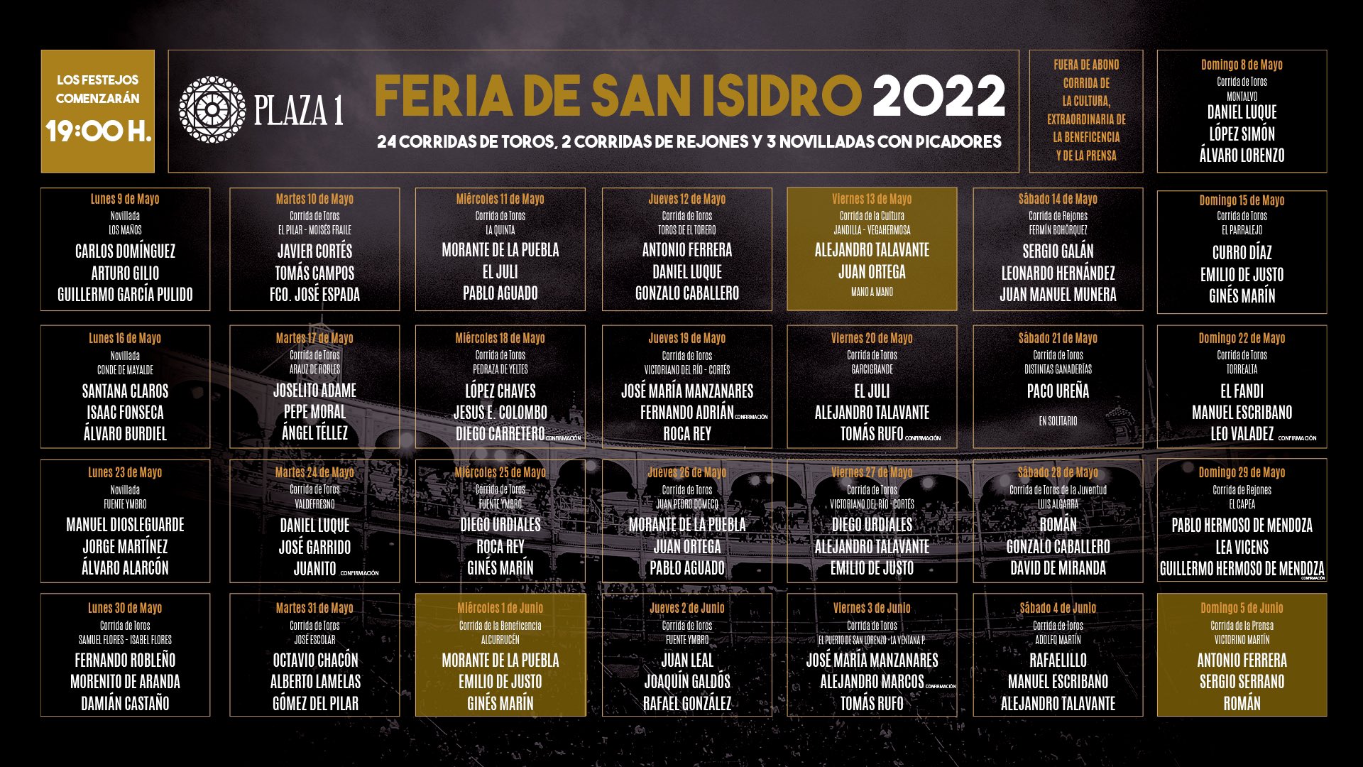 La temporada taurina de 2022 ya tiene carteles oficiales para la Feria de San Isidro de Madrid. En una gala celebrada en la Monumental de Las Ventas en la que se ha premiado póstumamente a Elia Rodríguez, a Isabel Díaz Ayuso y Morante de La Puebla, entre otros, se han presentado los carteles del primer San Isidro post pandemia en el coso de la Calle de Alcalá ya que la de 2021 se celebró en Vistalegre. Esta temporada que ya está en marcha tiene ya en la calle los carteles de Valencia, Castellón y Sevilla.