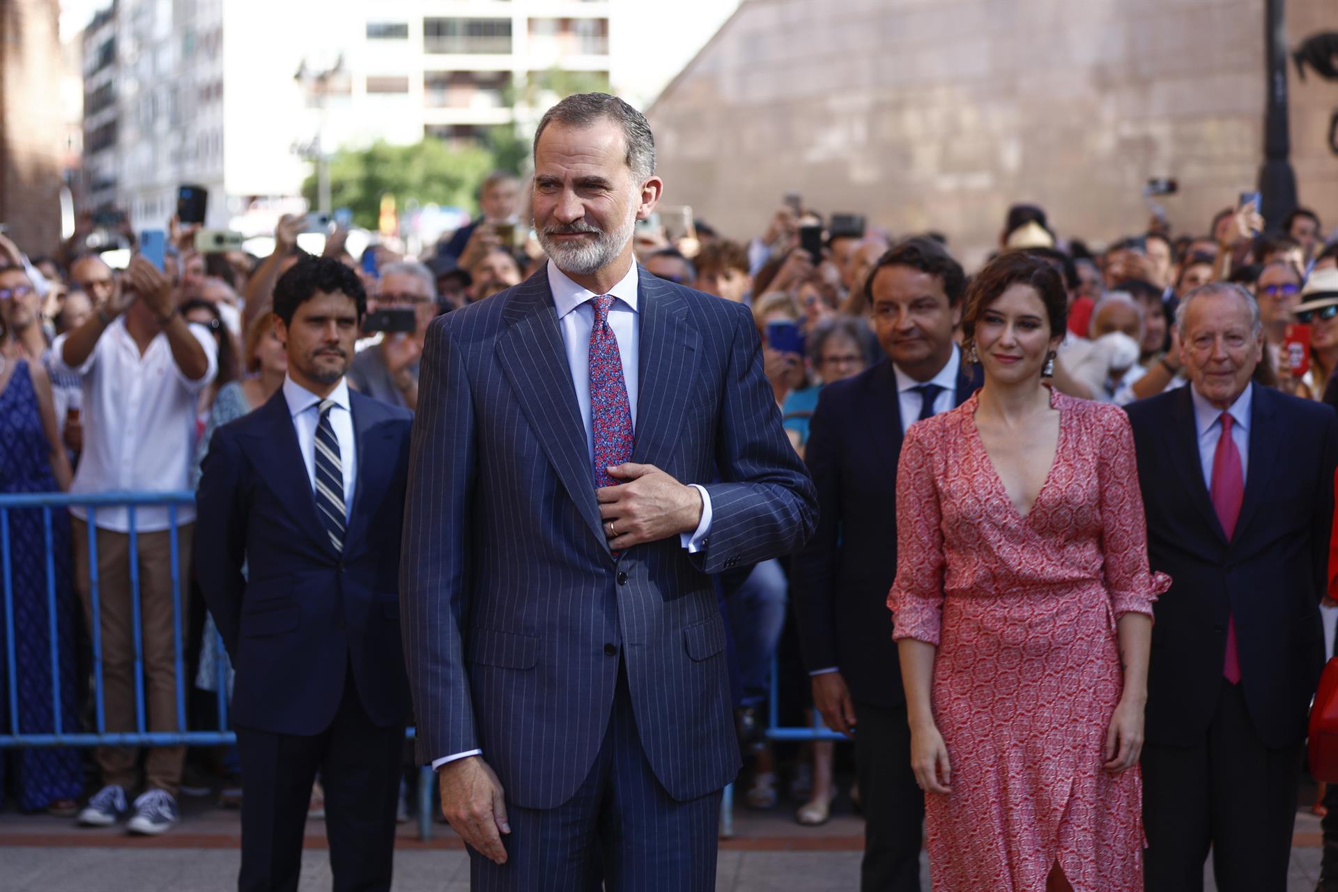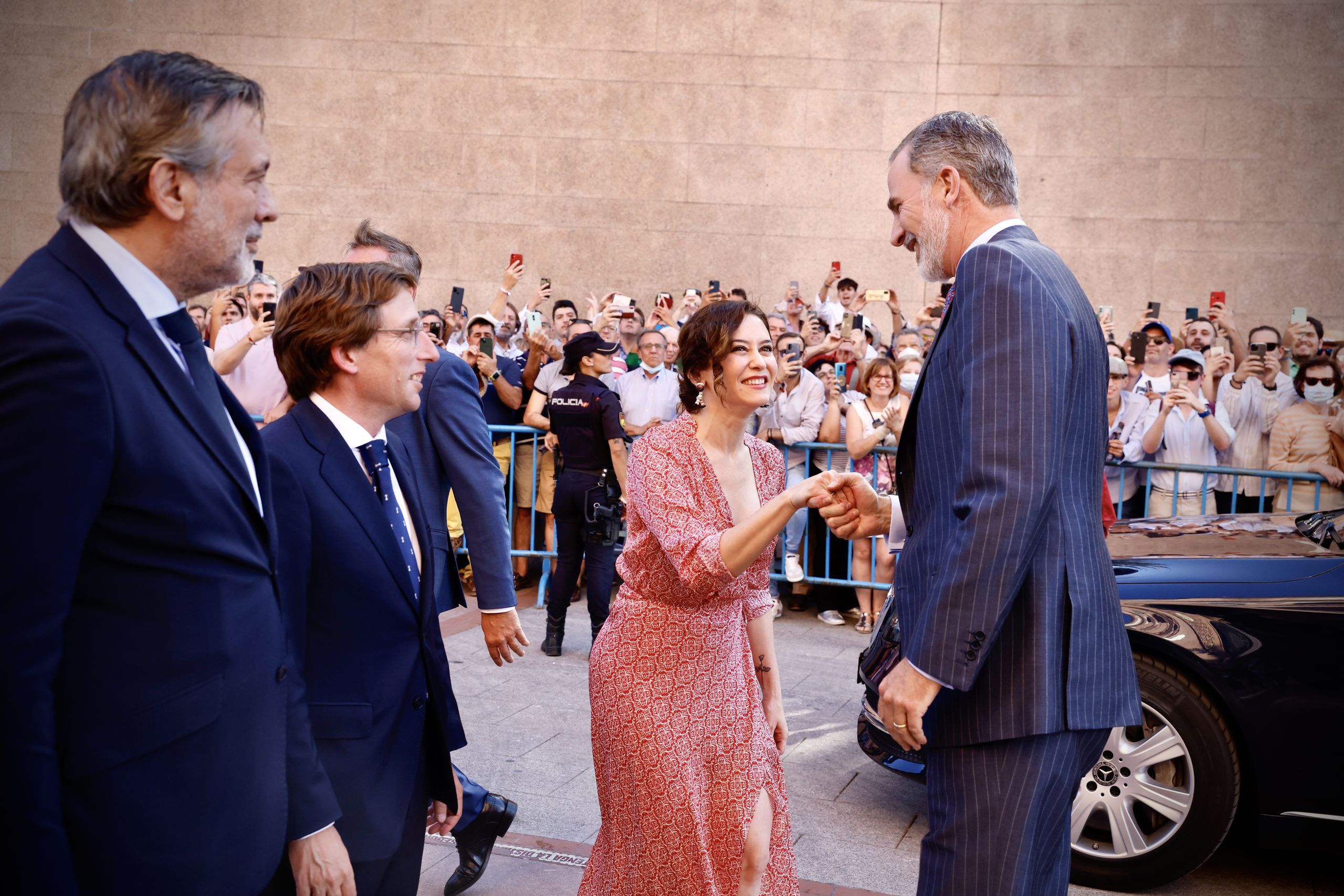 Isabel Díaz Ayuso junto al alcalde de Madrid, José Luis Martínez Almeida, y su consejero de Presidencia e Interior, Enrique López, esperan la llegada del rey.