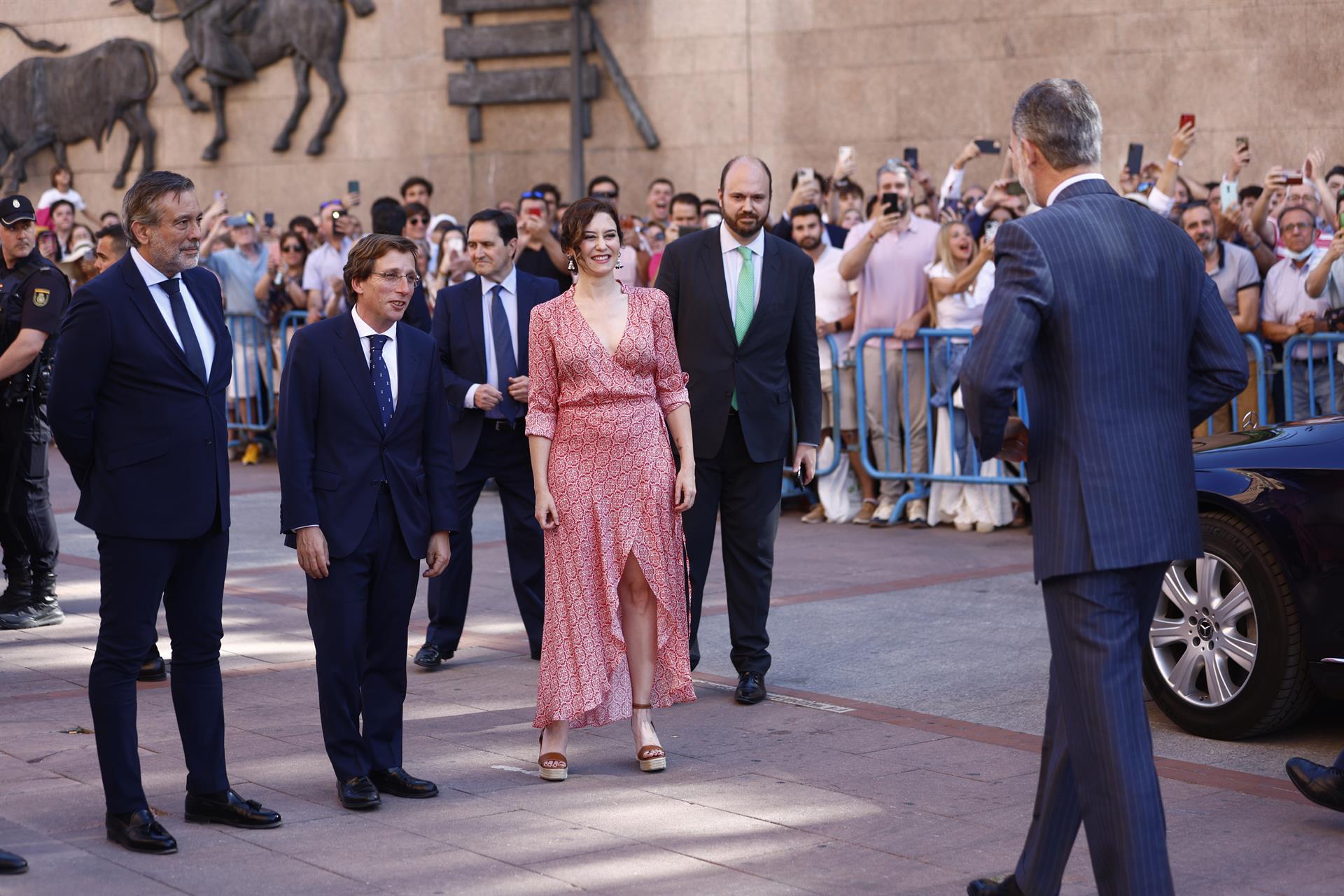 La presidenta madrileña saluda al monarca a su llegada a la plaza de toros.