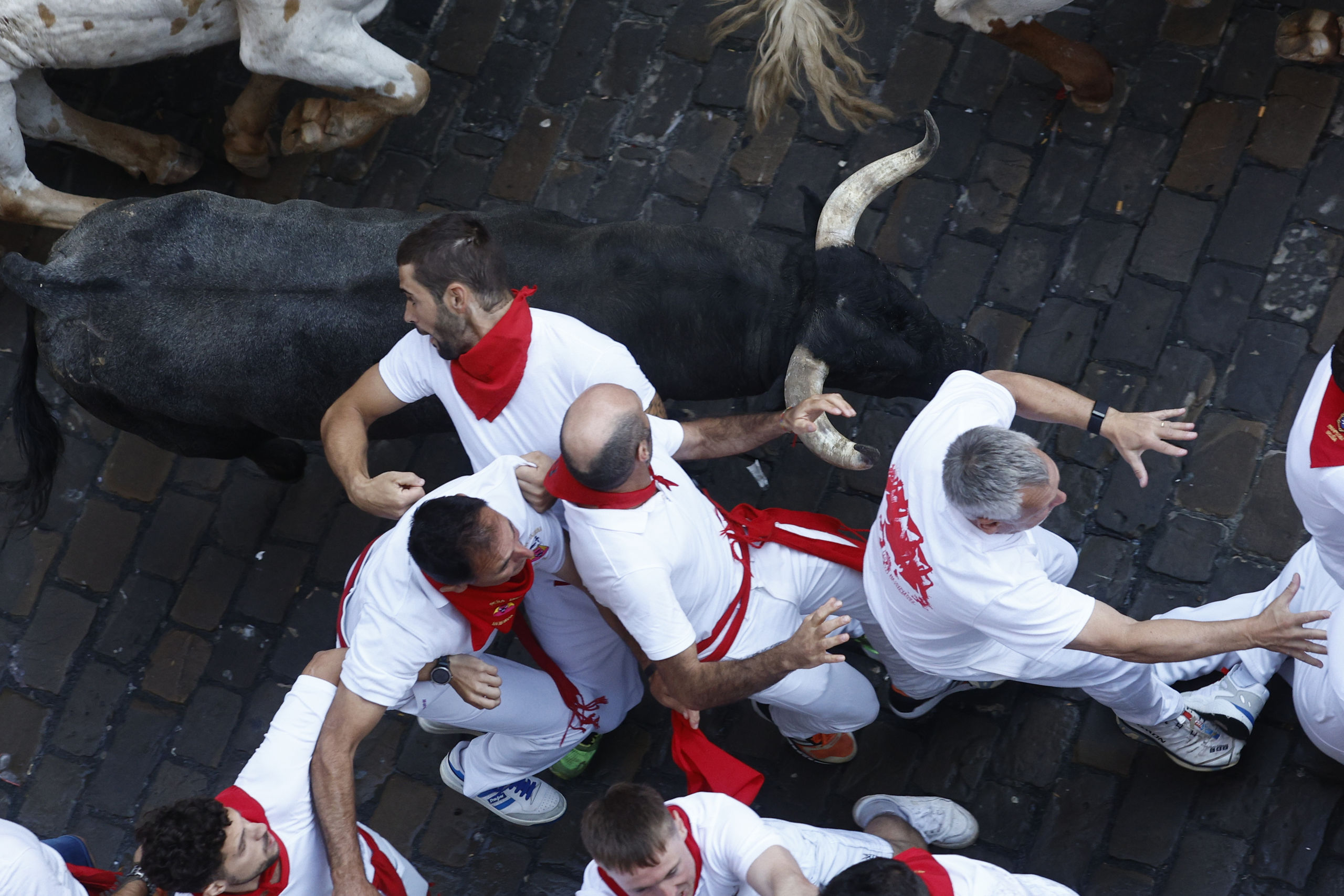 Poco antes, en la curva de Mercaderes se ha registrado uno de los momento más peligrosos, cuando uno de los astados ha encerrado a varios mozos contra la pared. Según el primer parte médico se han solicitado cuatro traslados al Hospital Universitarios de Navarra, ninguno de ellos por asta de toro con herida penetrante, según ha detallado el servicio de emergencias.