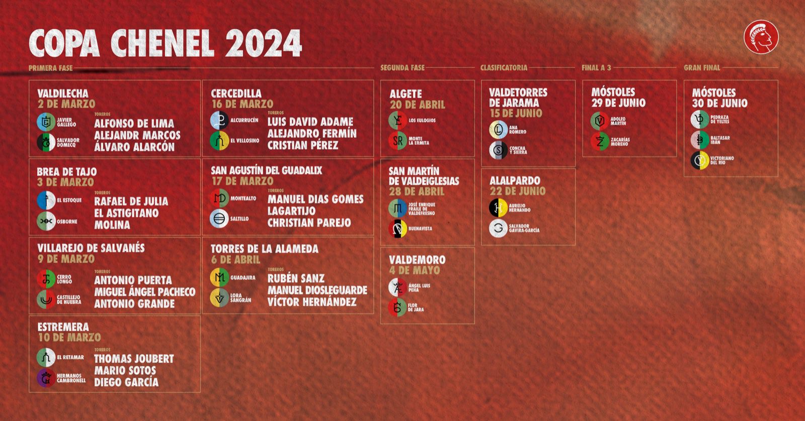 De la Comunidad de Madrid han sido elegidos: Diego García, Víctor Hernández y Rafael de Julia, veterano matador de toros y exprofesor de la Escuela Taurina José Cubero Yiyo. También estarán: el extremeño Alejandro Fermín; los andaluces Javier Moreno Lagartijo, Ángel Jiménez El Astigitano, Christian Parejo y Miguel Ángel Pacheco. De Castilla-La Mancha participan: José Fernando Molina, Cristian Pérez, Álvaro Alarcón y Mario Sotos. De Castilla y León lo harán: Manuel Diosleguarde, Alejandro Marcos, Antonio Grande y Rubén Sanz. Por parte de Murcia participa Antonio Puerta. Los toreros internacionales que participan en la cuarta edición de la Copa Chenel son: el francés Thomas Joubert; el mexicano Luis David Adame; el peruano Alfonso de Lima y el portugués Manuel Dias Gomes.