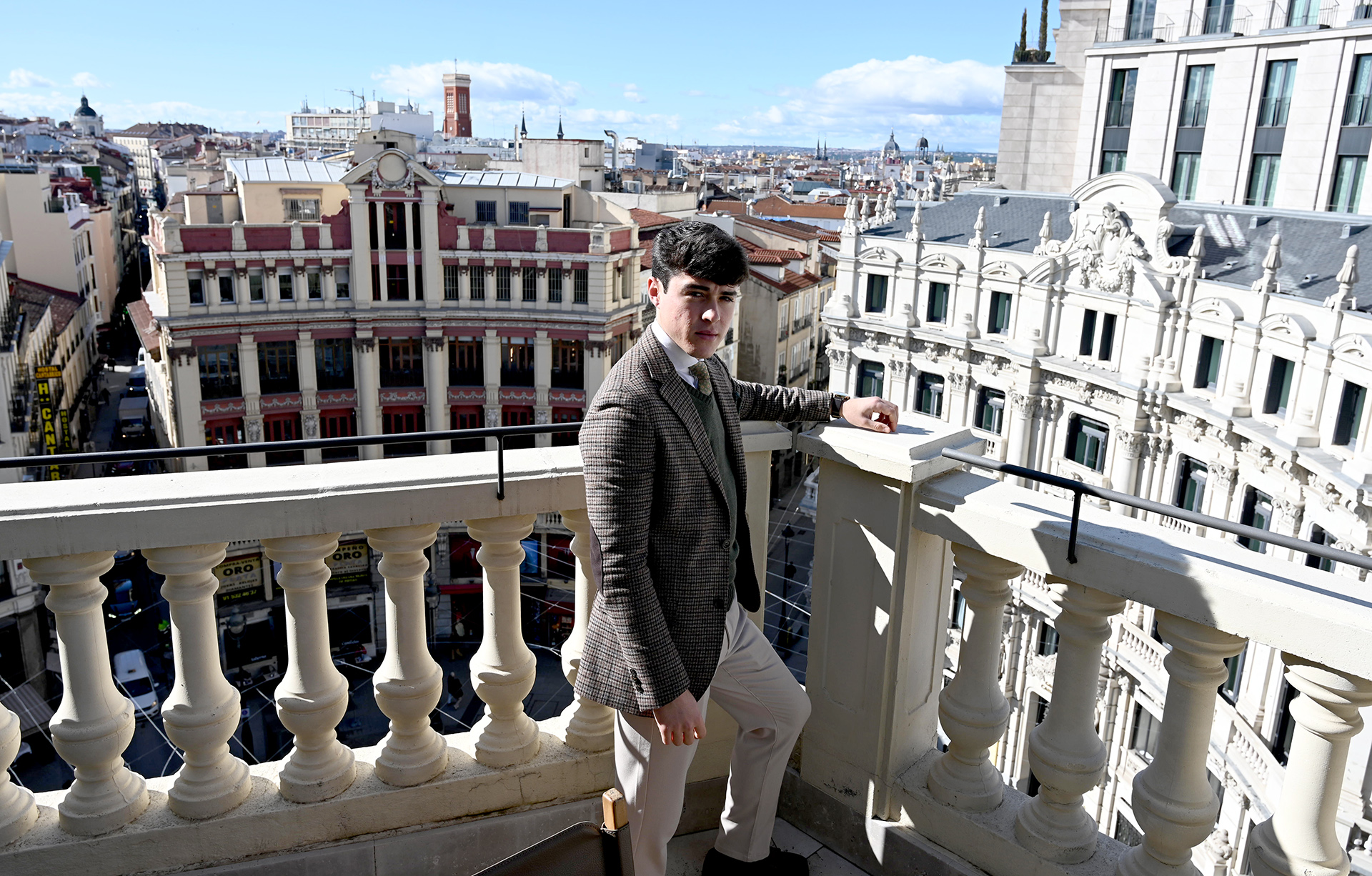 Roberto Martín Jarocho (Huerta el Rey, Burgos, 2004), tiene el mismo nombre y apodo que su padre, que fue matador de toros de alternativa, pero que se cambió al escalafón de plata y hoy, además, ejerce como su apoderado y hombre de confianza. Este torero llamó la atención en su multitudinaria Puerta Grande acompañando de gran cantidad de jóvenes que lo lanzaron en volandas hacia la calle de Alcalá la pasada primavera. Se cita con Libertad Digital en el Hotel JW Marriot, en plena calle Sevilla y a pocos metros de la Puerta del Sol. Posa pacientemente para el fotógrafo en las agradables instalaciones de este moderno alojamiento con una de las vistas más privilegiadas del centro de Madrid. Previamente, ha asistido como invitado a la Real Casa de Correos, sede de la Comunidad de Madrid, para la presentación del Premio Nacional de Tauromaquia que impulsa el Senado junto a nueve CCAA después de que el ministro de Cultura, Ernest Urtasun, lo eliminara por cuestiones ideológicas.