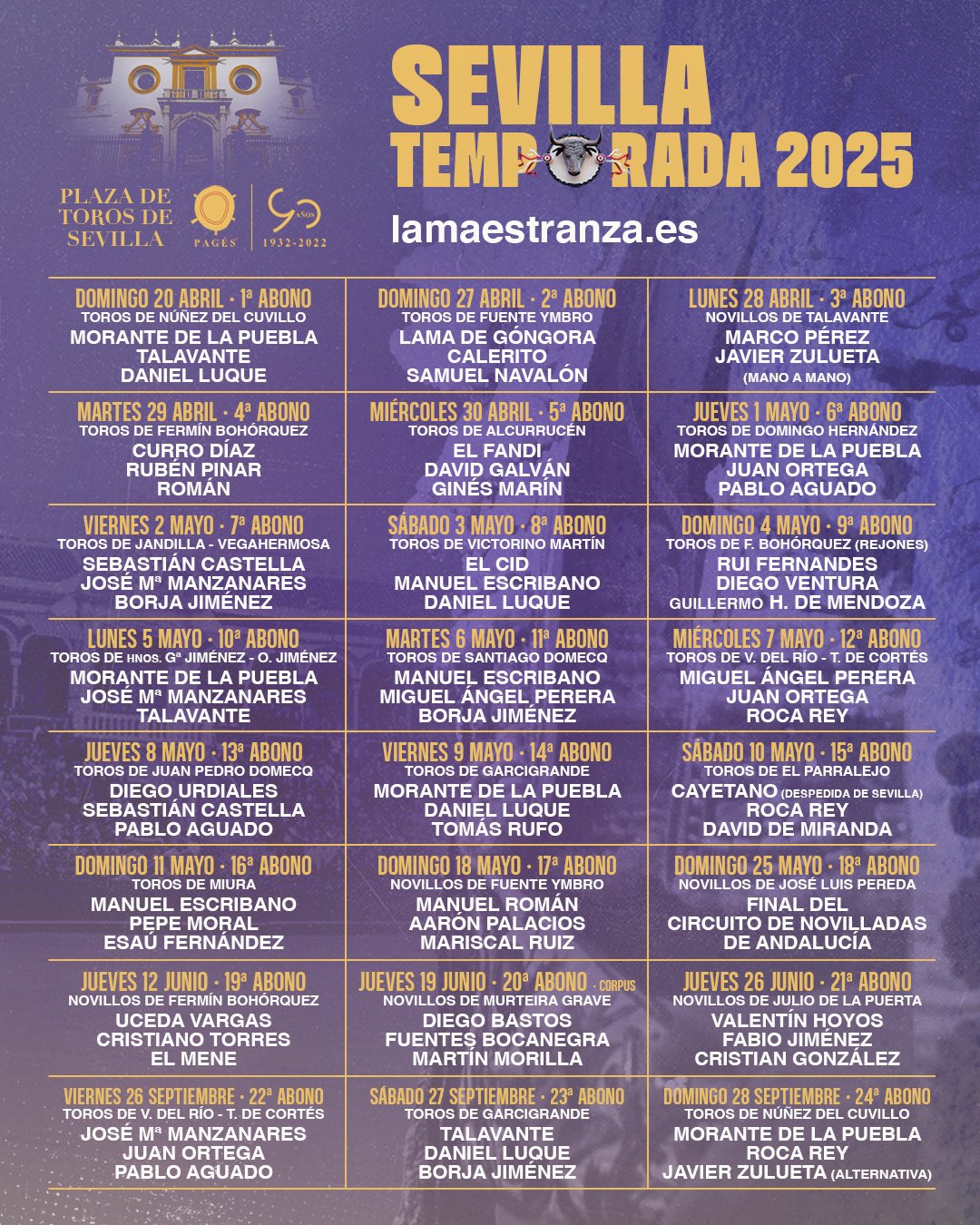 La Feria de Abril de año es muy tardía por el calendario eclesiástico y se solapará el final con el principio de San Isidro ya en la segunda semana de mayo, el 9, 10 y 11 de mayo. La temporada arranca el 20 de abril y hay una corrida anunciada una semana después, domingo 27. Ese día arranca el ciclo continuado que ya se extiende hasta la corrida de Miura que pone el broche, como es tradición en Sevilla desde hace años.