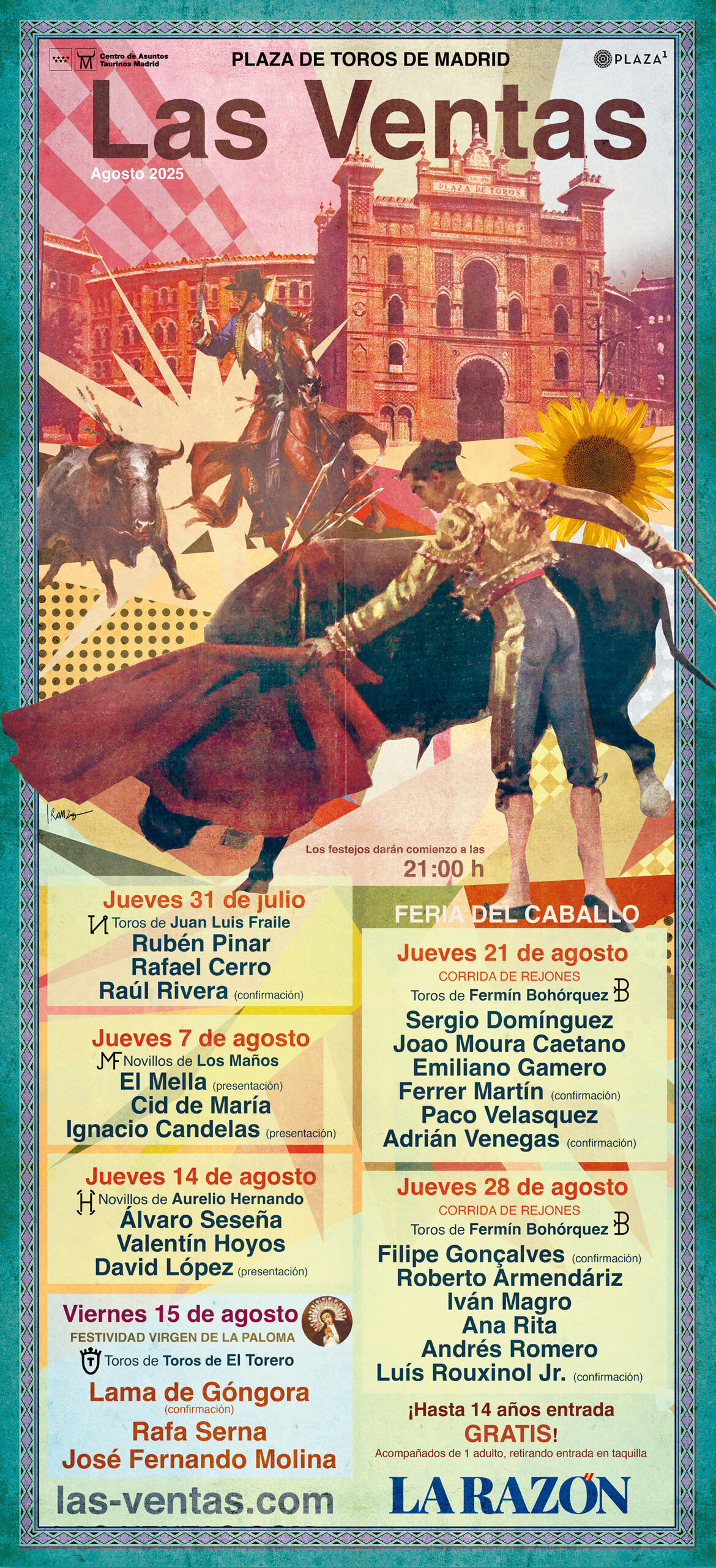 La programación veraniega en Las Ventas incluye cuatro novilladas con picadores, dos de ellas del certamen Cénate Las Ventas, dos corridas de toros y dos corridas de toreo a caballo que corresponden a la Feria del Caballo, con la que se cierra el mes de agosto en la Monumental madrileña. Las corridas de toros son de Juan Luis Fraile el 31 de julio y de El Torero para el 15 de agosto, Día de La Paloma. La primera contará con los matadores de toros Rubén Pinar, Rafael Cerro y la confirmación de alternativa de Raúl Rivera y la segunda con la confirmación de Lama de Góngora, Rafa Serna y José Fernando Molina. Estos dos últimos han destacado en su paso por Las Ventas esta campaña. Así, continúa Madrid con una temporada que ya es histórica por la Puerta Grande de Morante de La Puebla en la Corrida de la Beneficencia y se van calentando los motores para el septiembre torista y la Feria de Otoño.