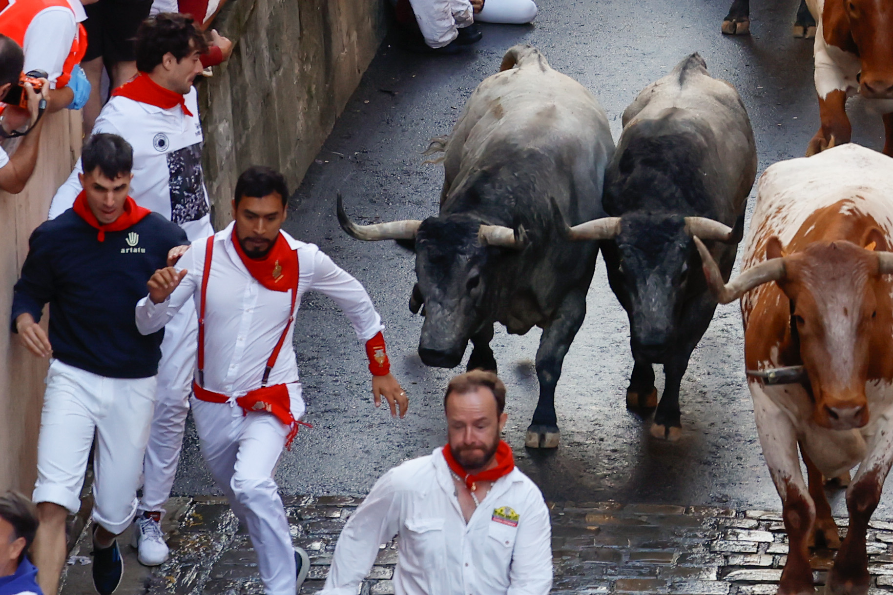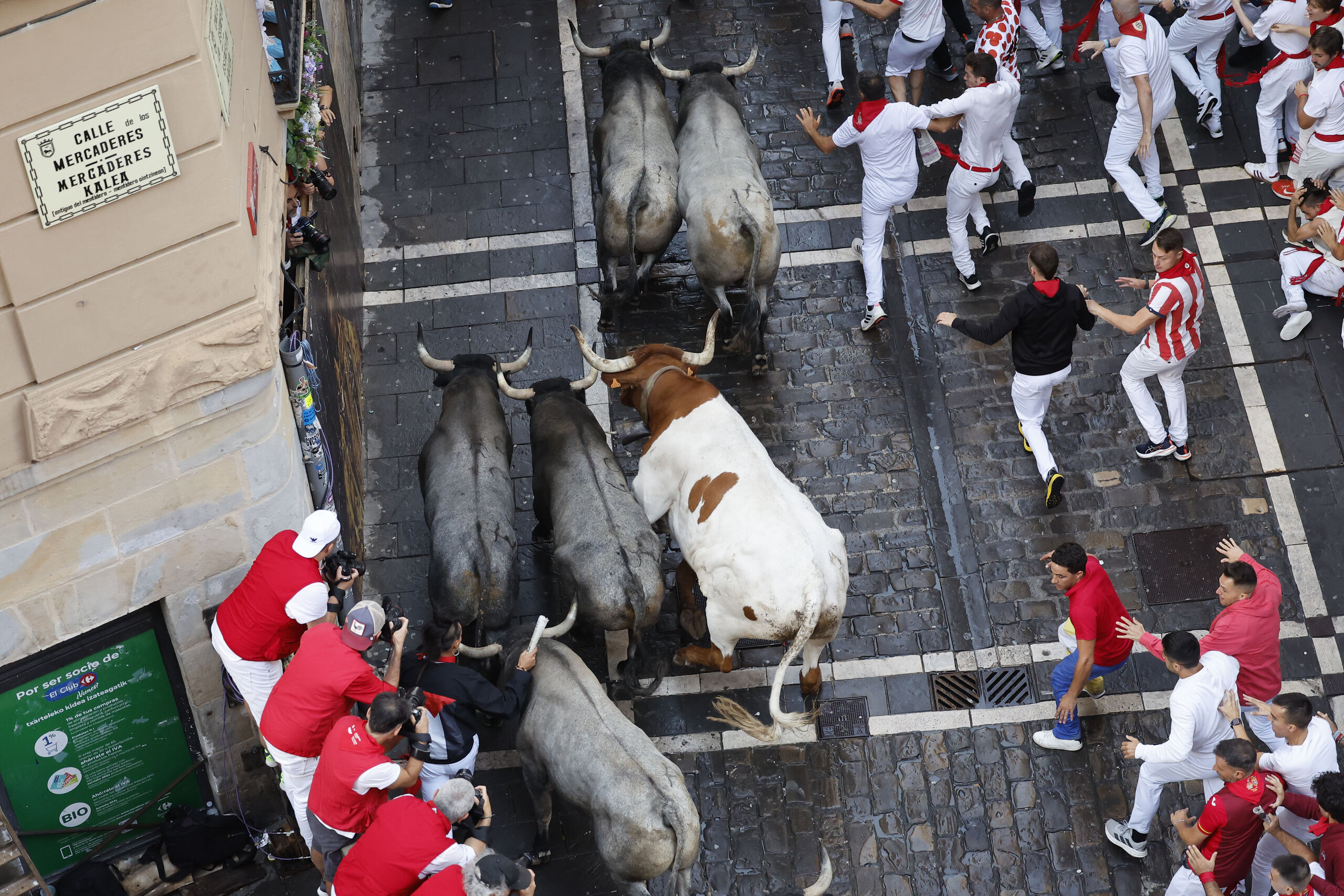 El encierro ha comenzado puntualmente a las 08.00 horas con el lanzamiento del primer cohete. Desde los corralillos de Santo Domingo, los mozos, vestidos de blanco y pañuelo rojo, aguardaban expectantes. La manada ha irrumpido con fuerza, desplegándose a gran velocidad por las calles del centro histórico.