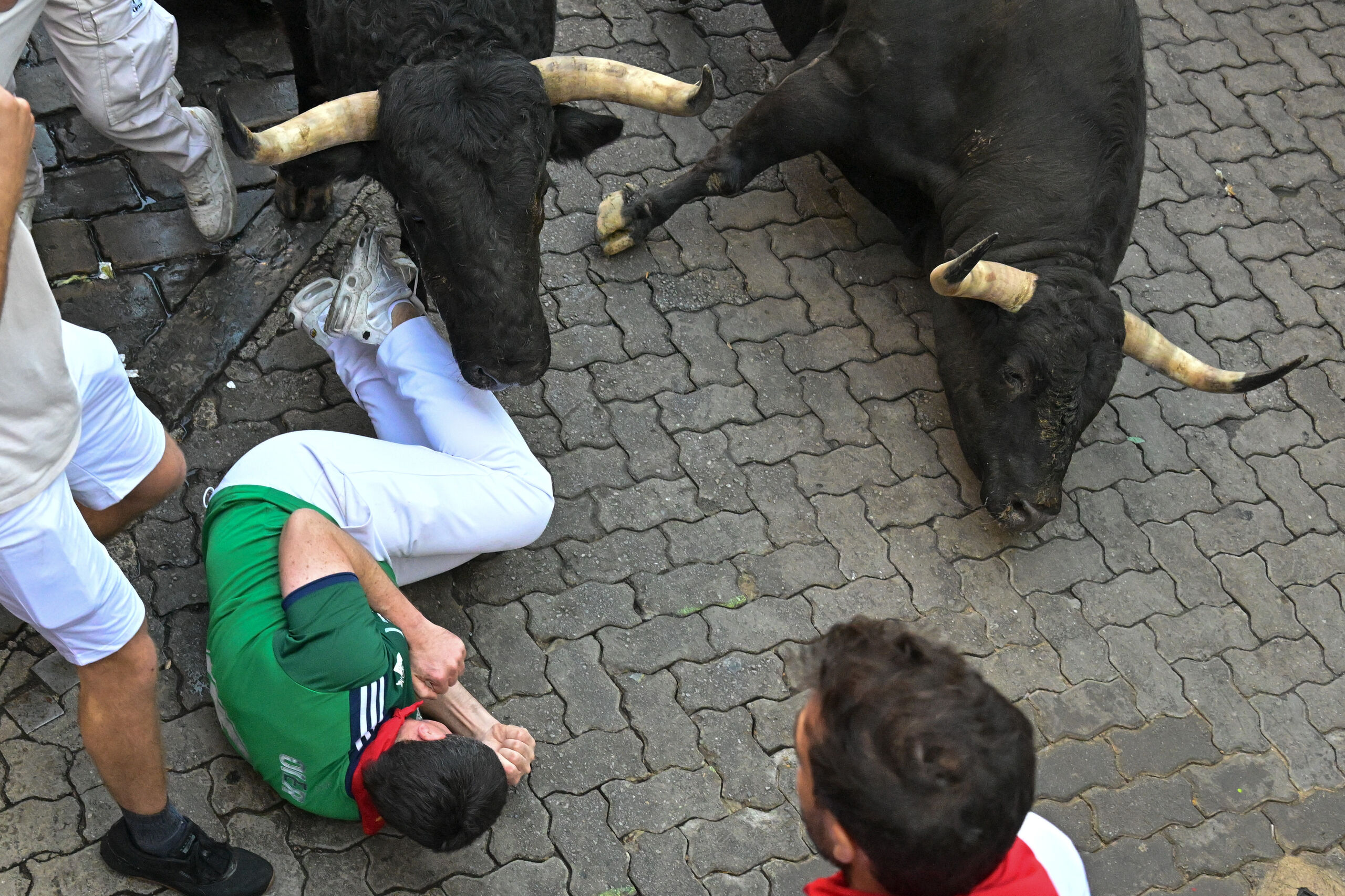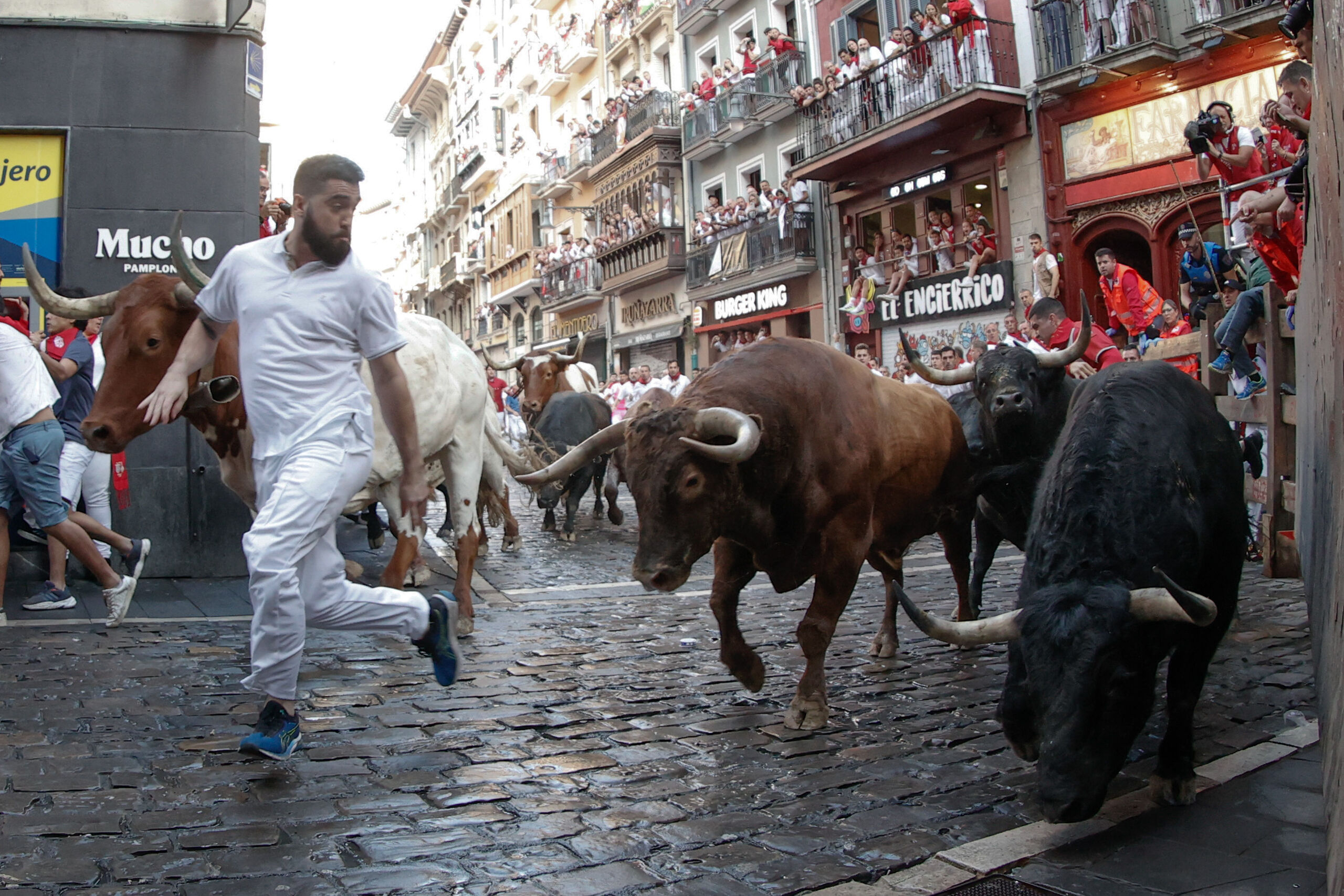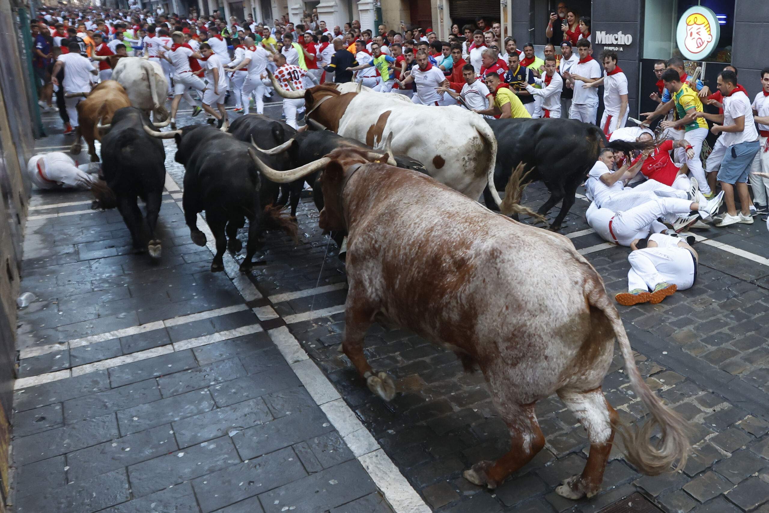 El toro que lideraba la carrera embistió con violencia a un mozo en Santo Domingo. Lo lanzó por los aires tras cornearle en la pierna y cayó aparatosamente sobre el adoquinado.