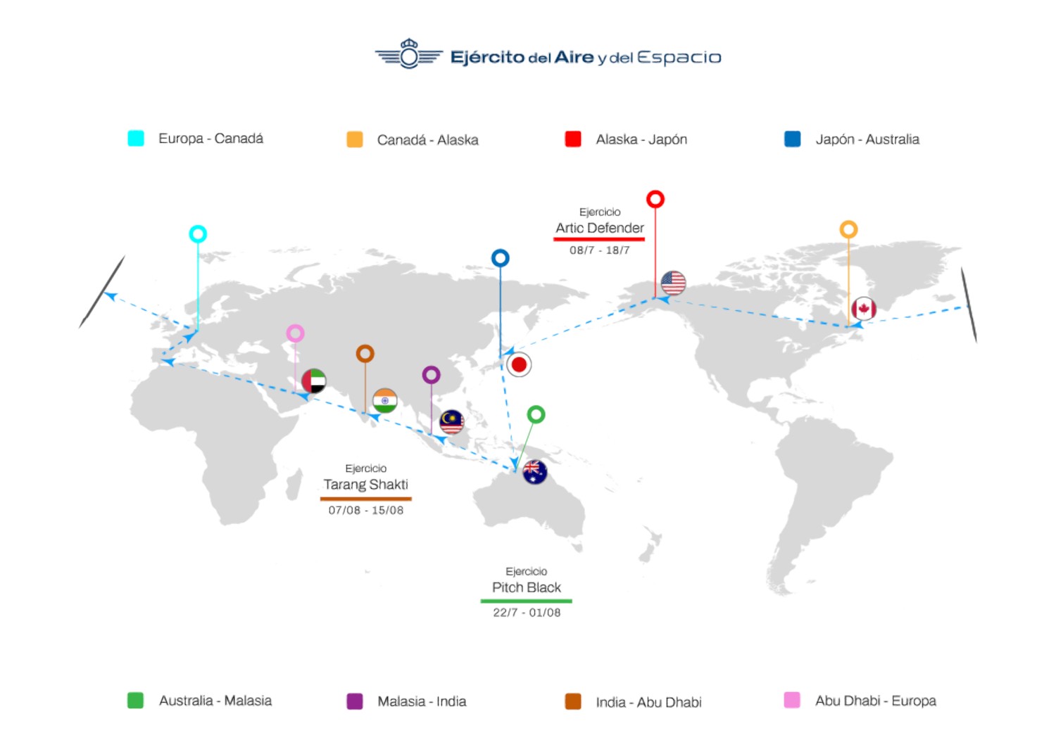 Los medios aéreos españoles han recorrido 58.000 kilómetros. El momento clave fue el paso de Alaska hasta Japón, cuando bordearon la frontera Este de Rusia, momento en el que pudieron ser identificados por los cazas de alerta rusos.