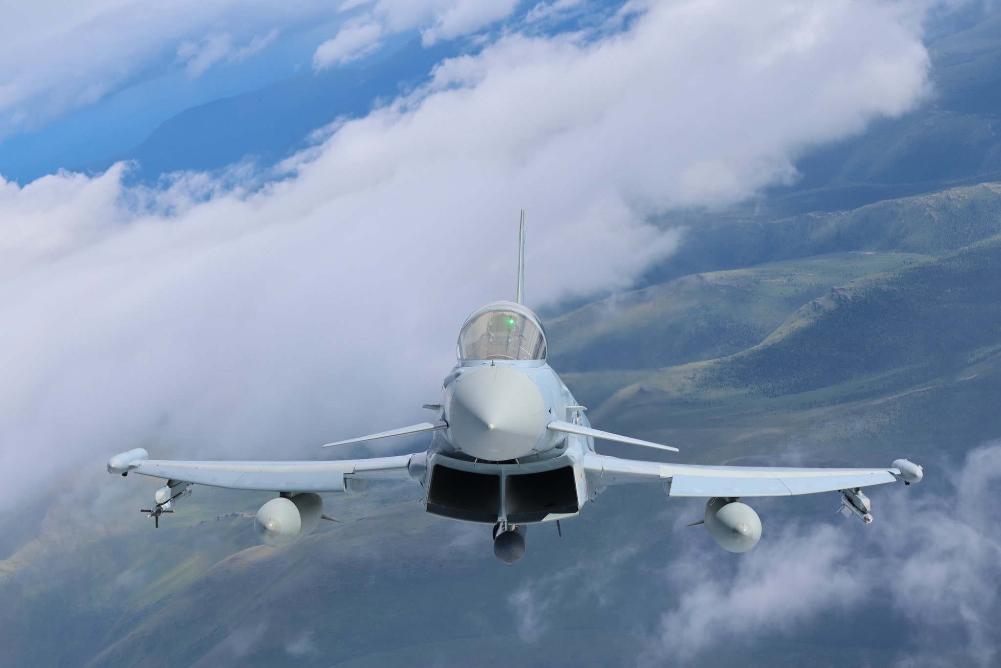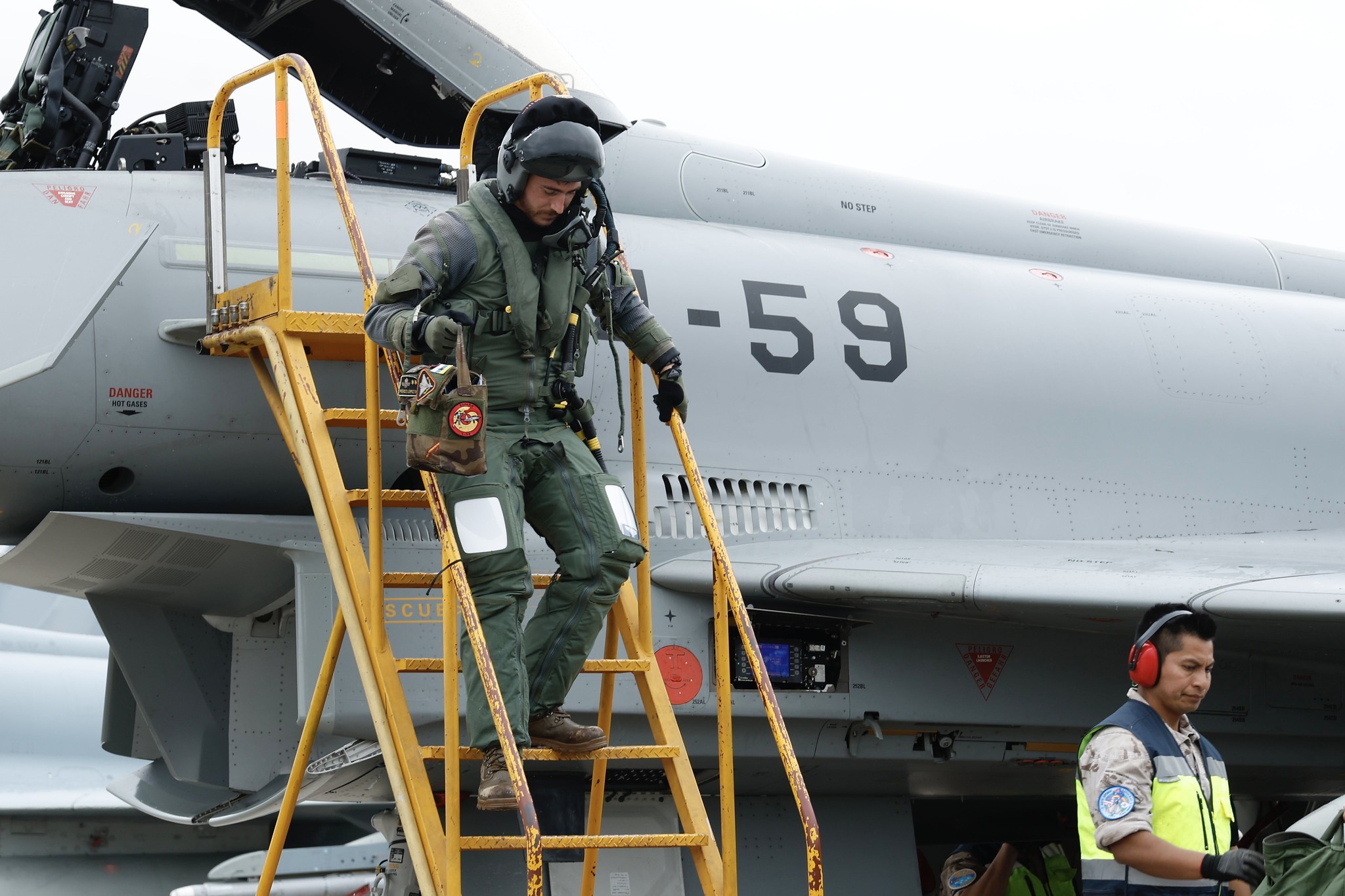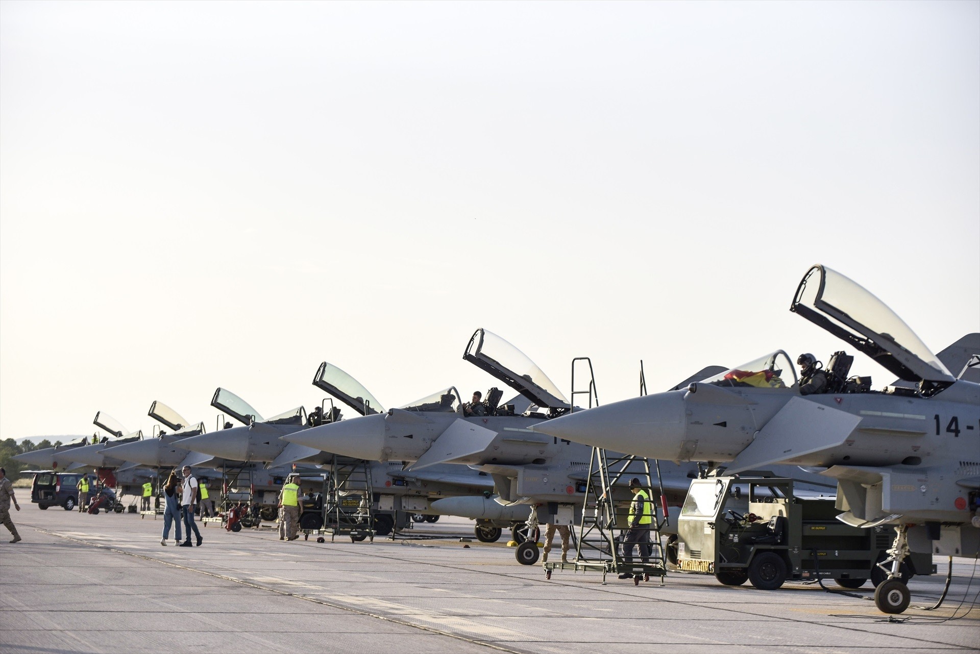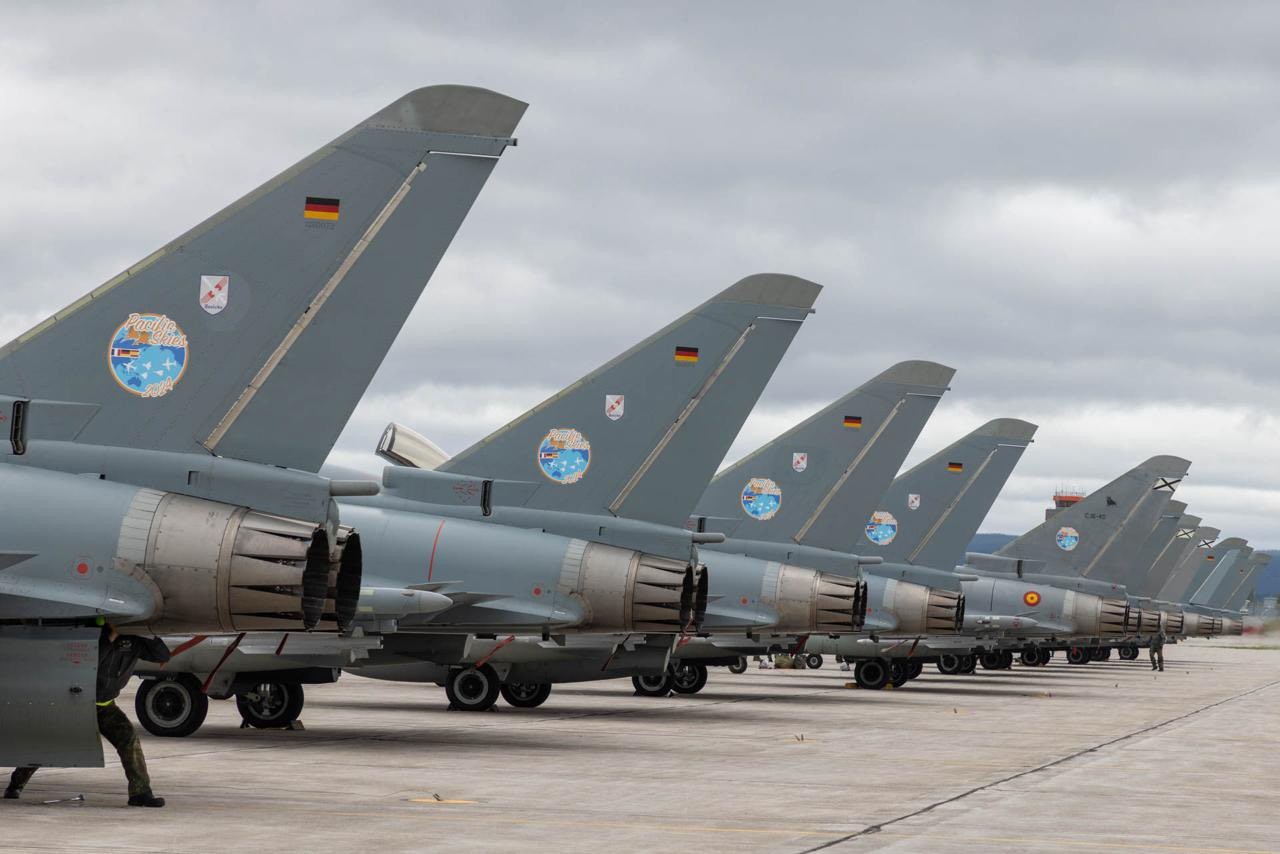 Los cazas Eurofighter Typhoon fueron los primeros en despegar con rumbo a la base aérea alemana de Noverning, en Colonia, donde se reunieron con los alemanes.
