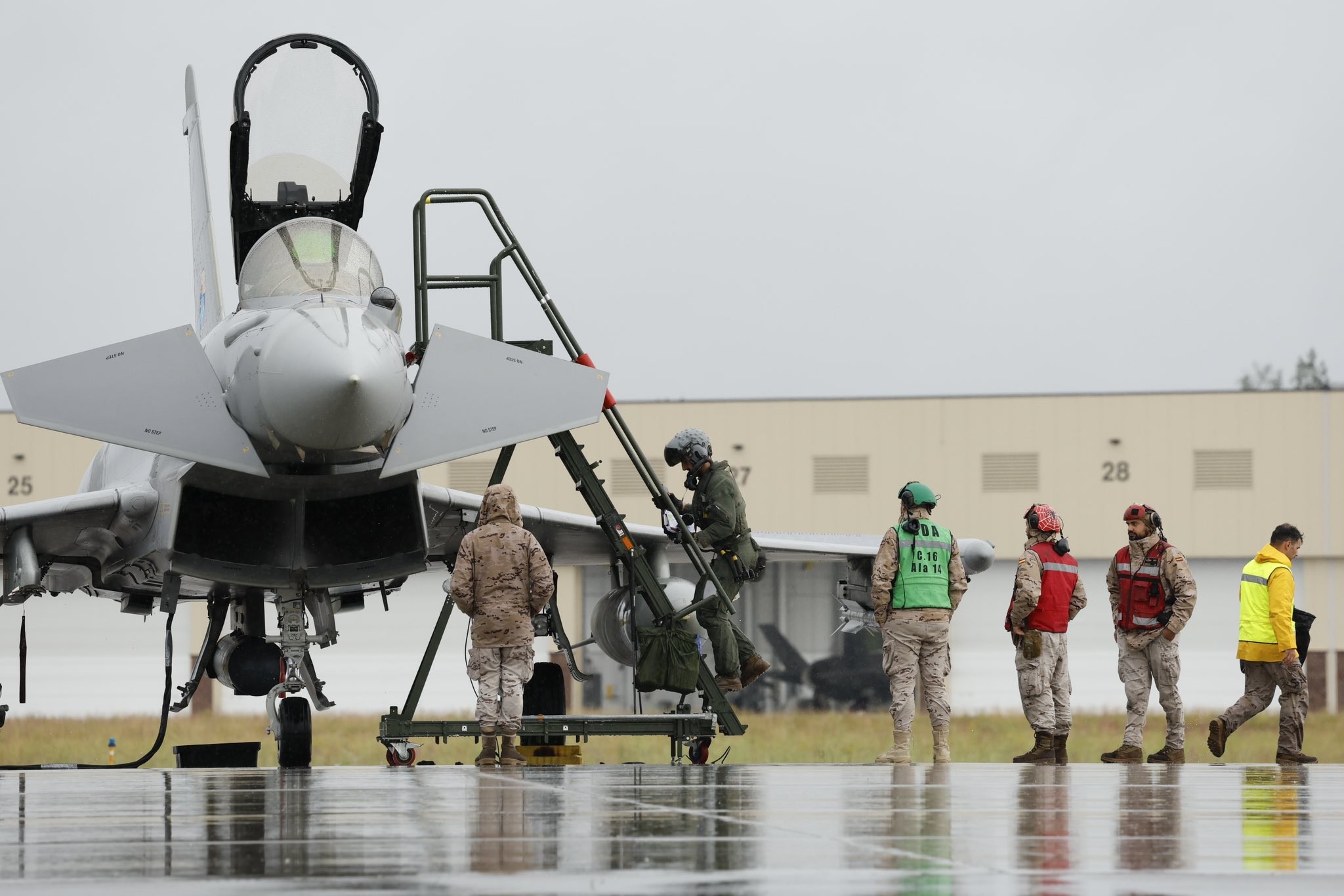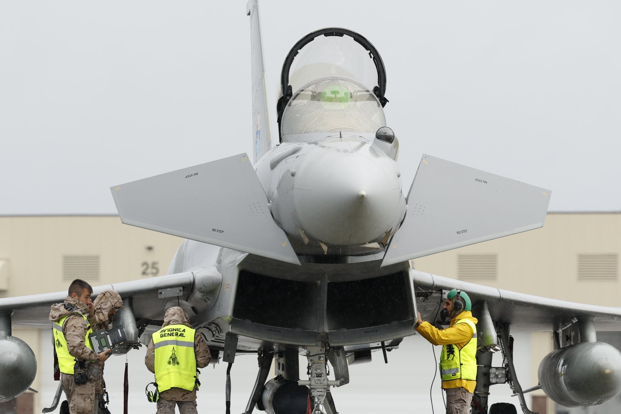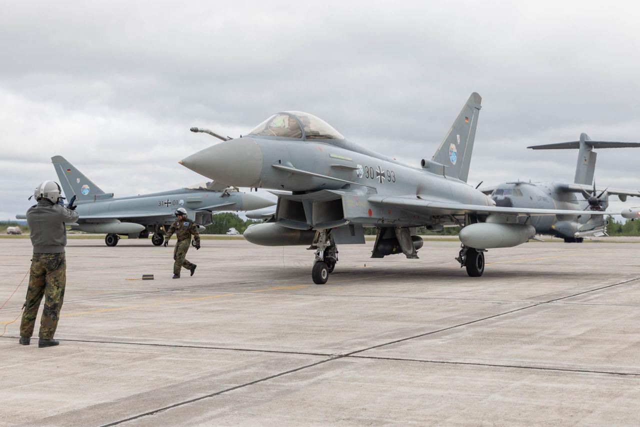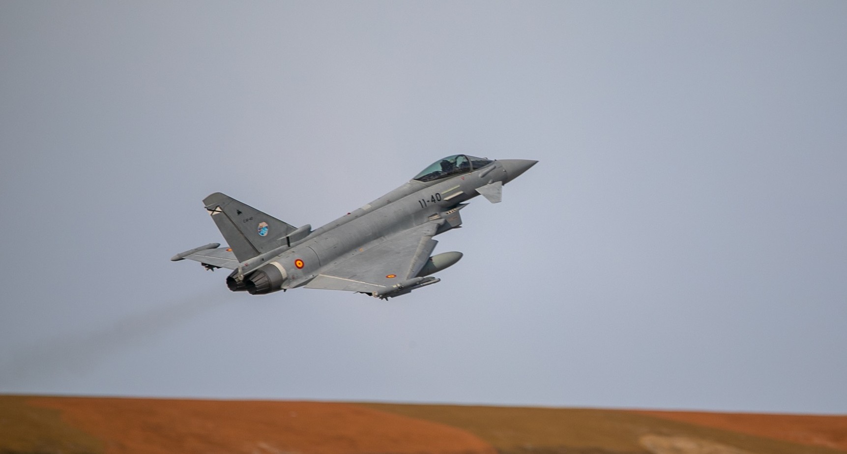 Los cazas Eurofighter Typhoon fueron los primeros en despegar con rumbo a la base aérea alemana de Noverning, en Colonia, donde se reunieron con los alemanes.
