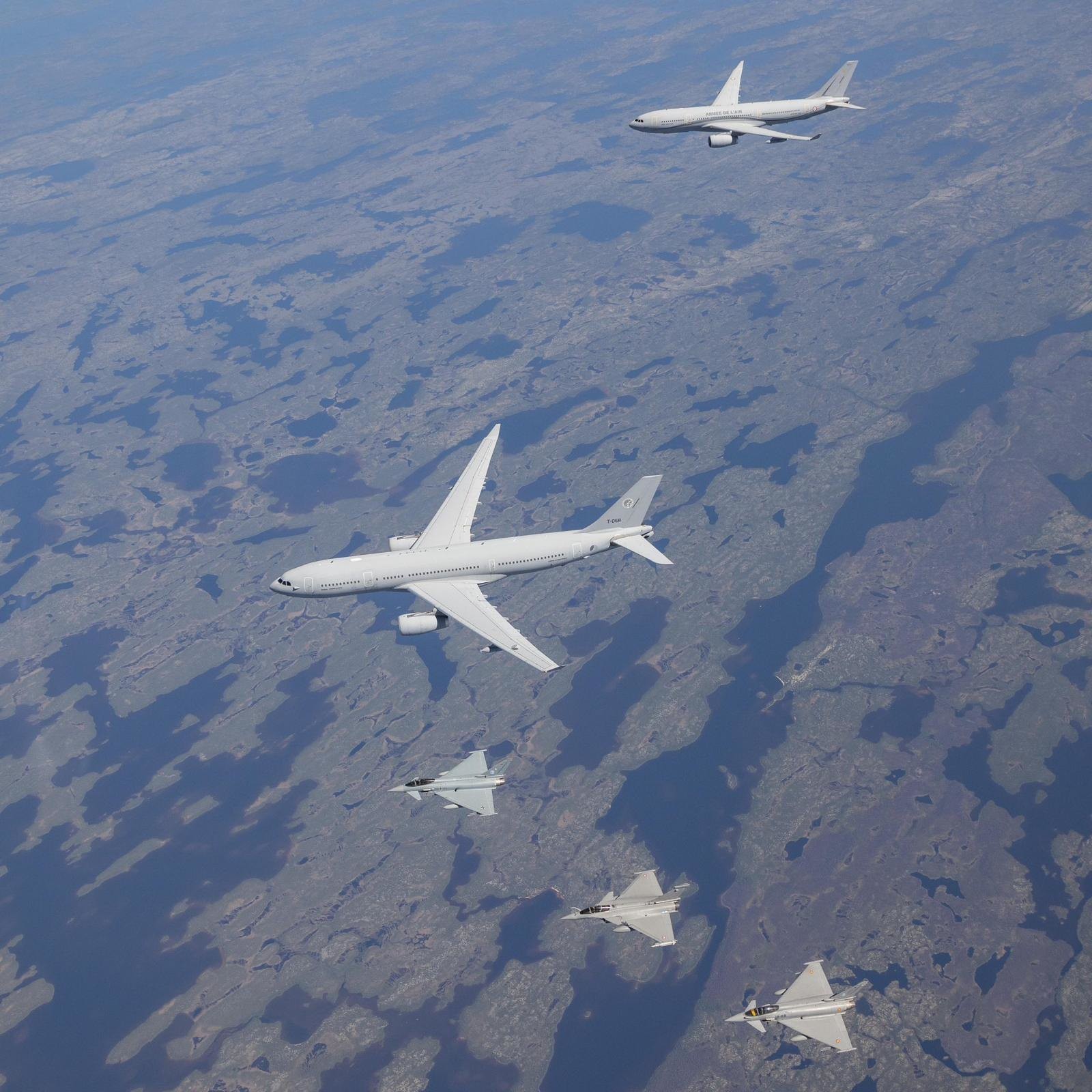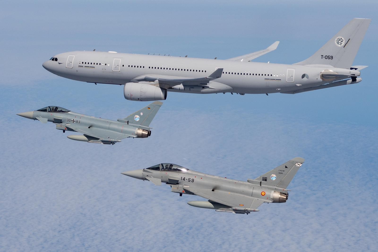 El tercer socio de este reto de dar la vuelta al mundo ha sido la Luftwaffe alemana. Ha aportado ocho cazas Eurofighter Typhoon, tres aviones de transporte A-400M y dos aviones cisterna A330 MRTT.