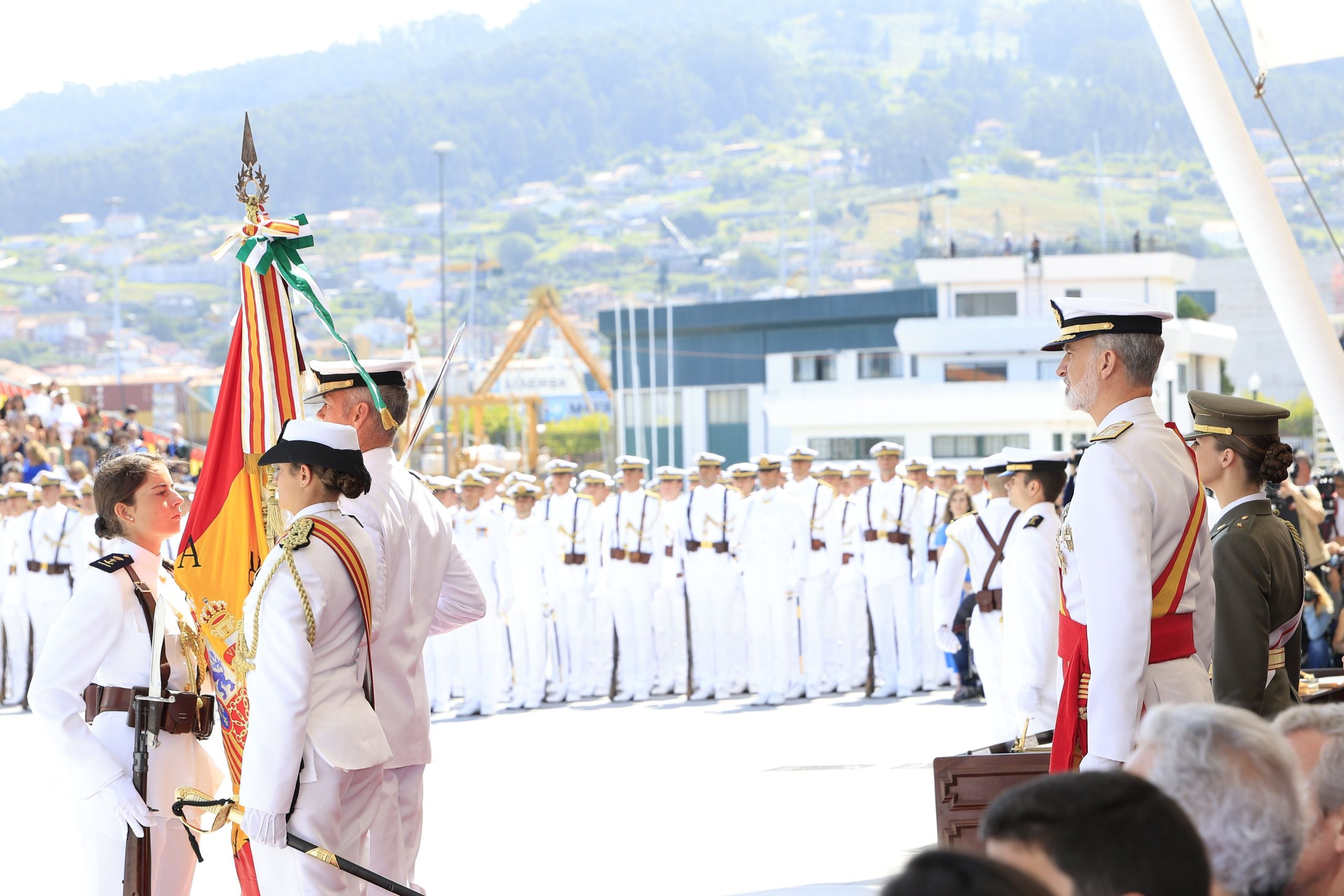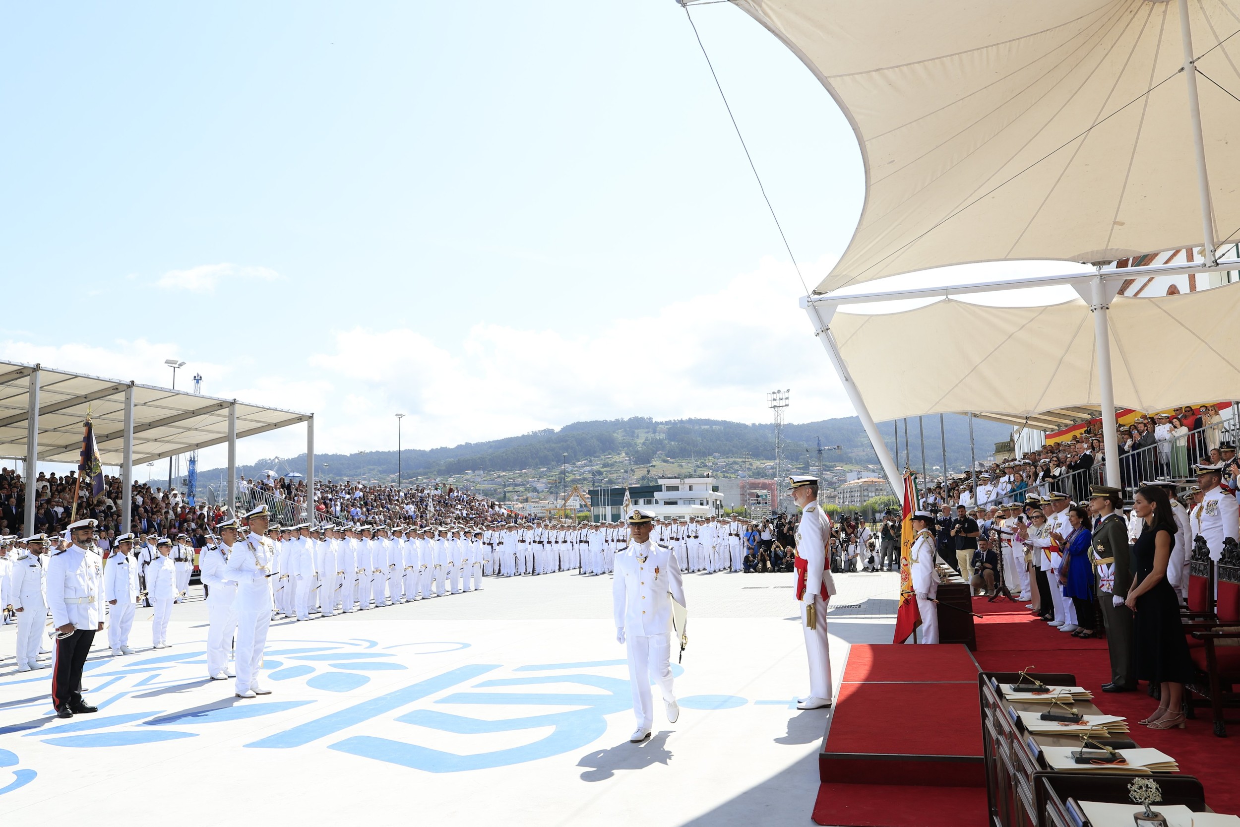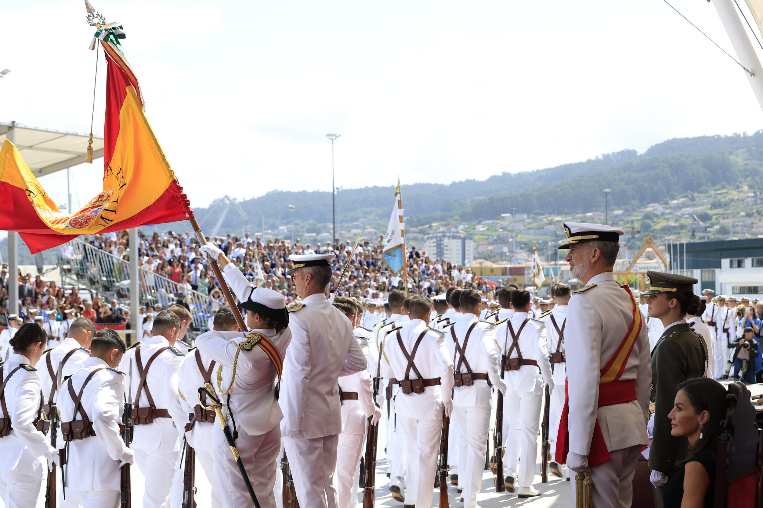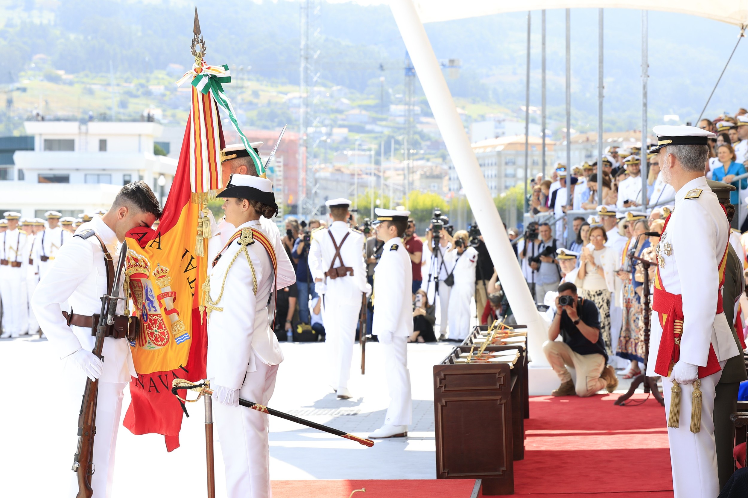 Los Reyes de España y la Princesa de Asturias han presidido el acto de entrega de reales despachos y la jura de bandera de los nuevos guardiamarinas en la Academia Naval Militar de Marín (Pontevedra).