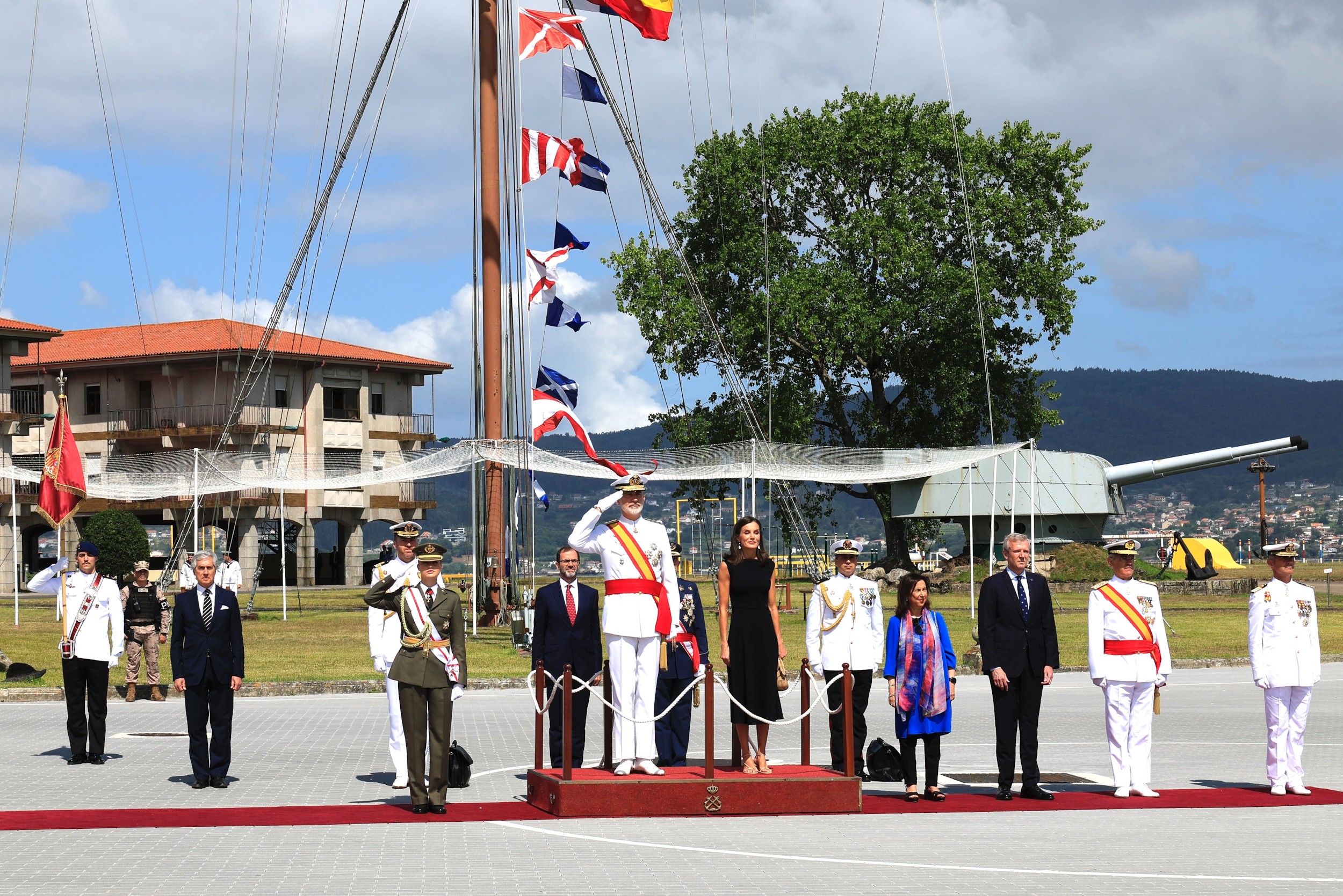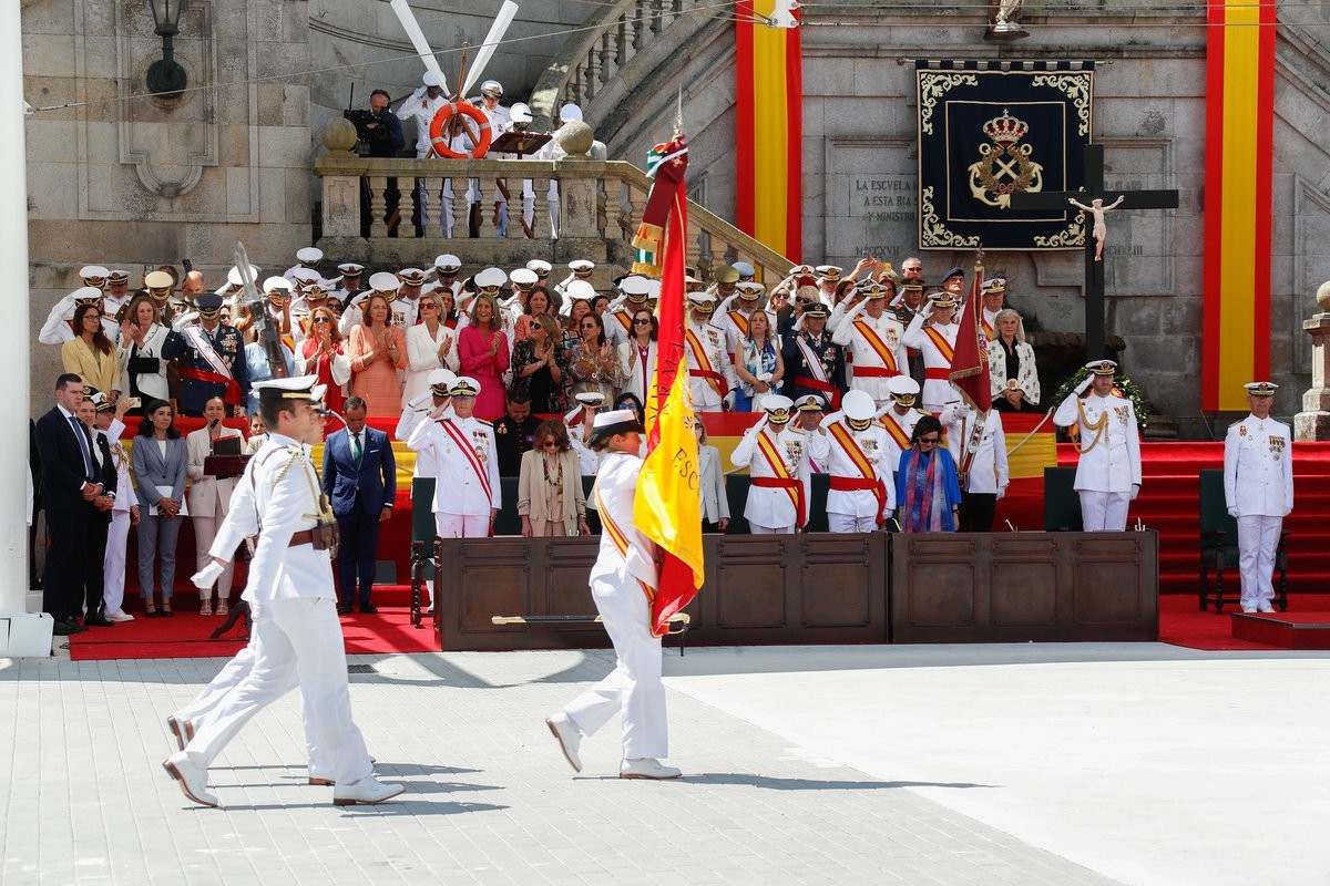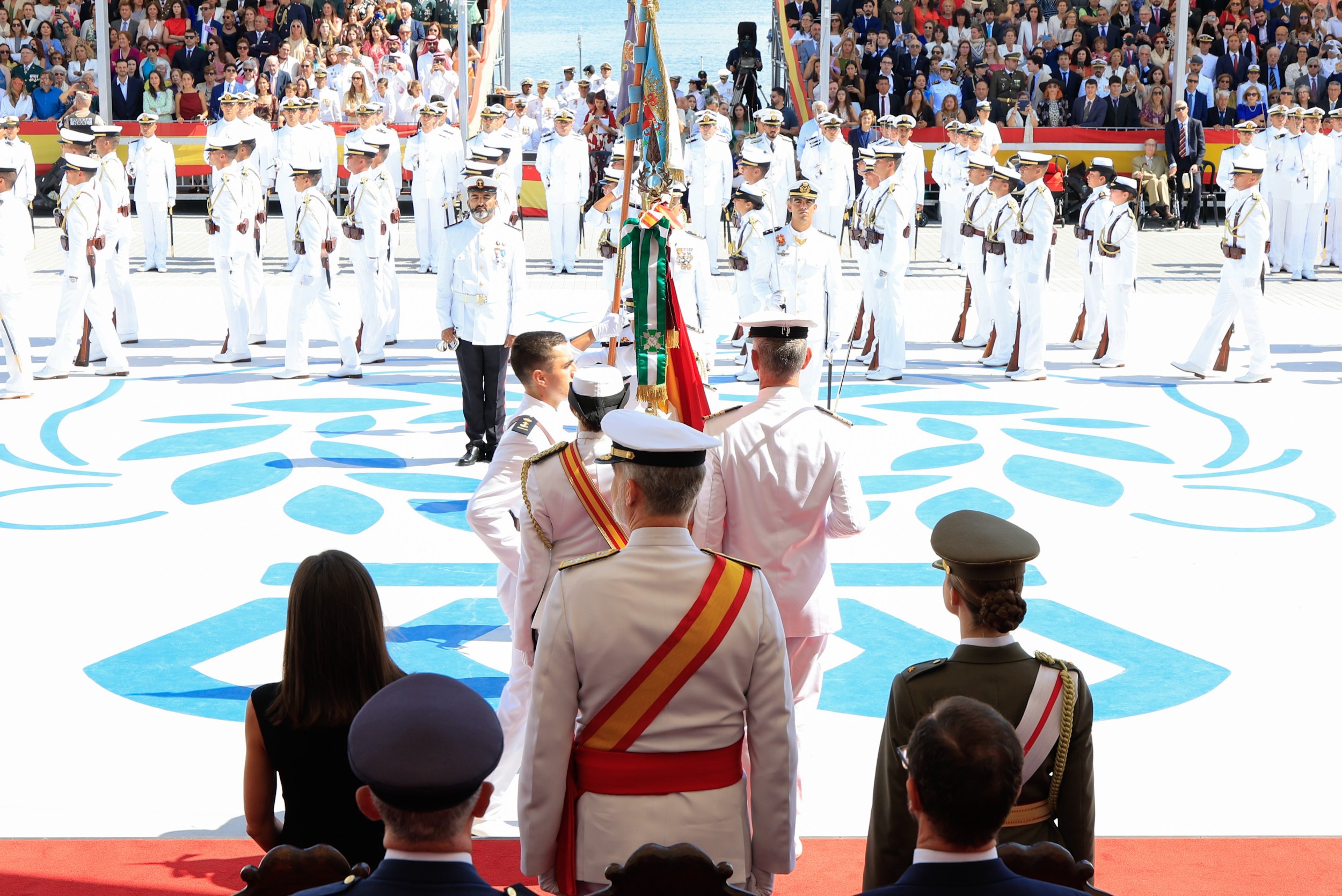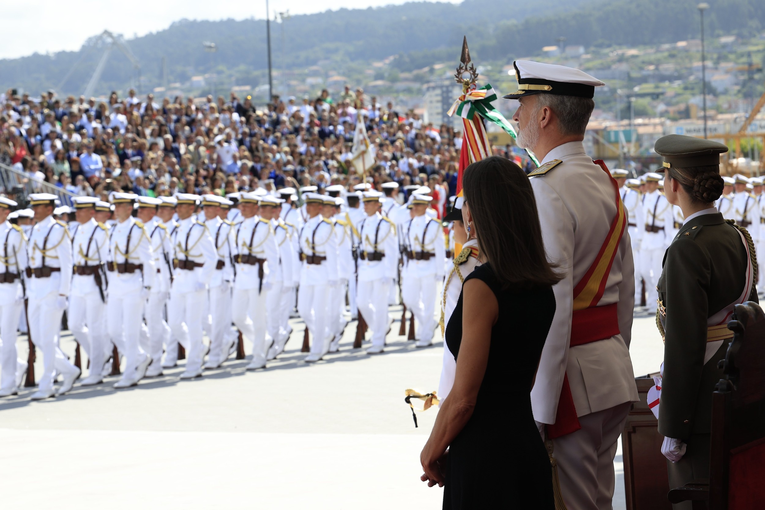 Los Reyes de España y la Princesa de Asturias han presidido el acto de entrega de reales despachos y la jura de bandera de los nuevos guardiamarinas en la Academia Naval Militar de Marín (Pontevedra).