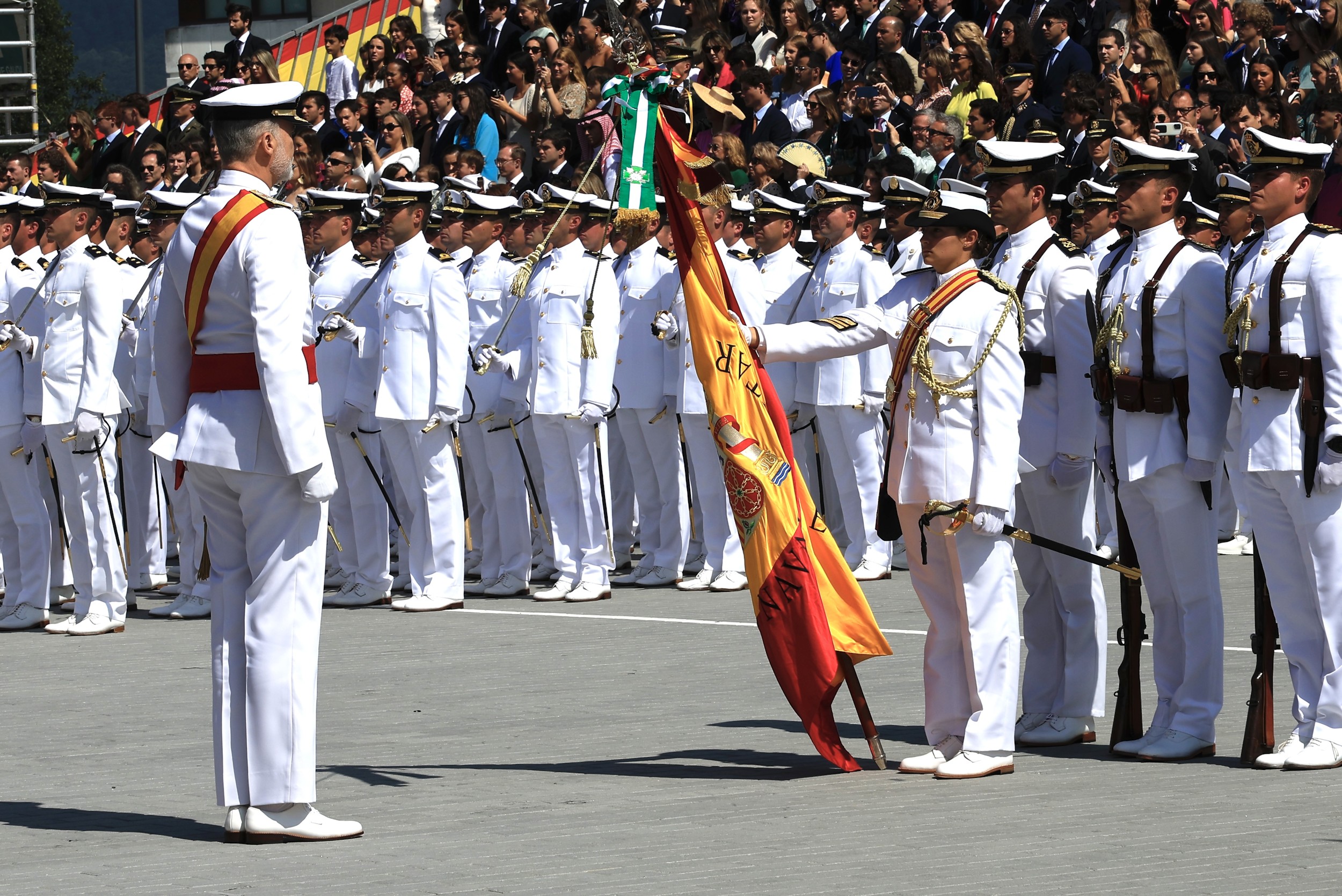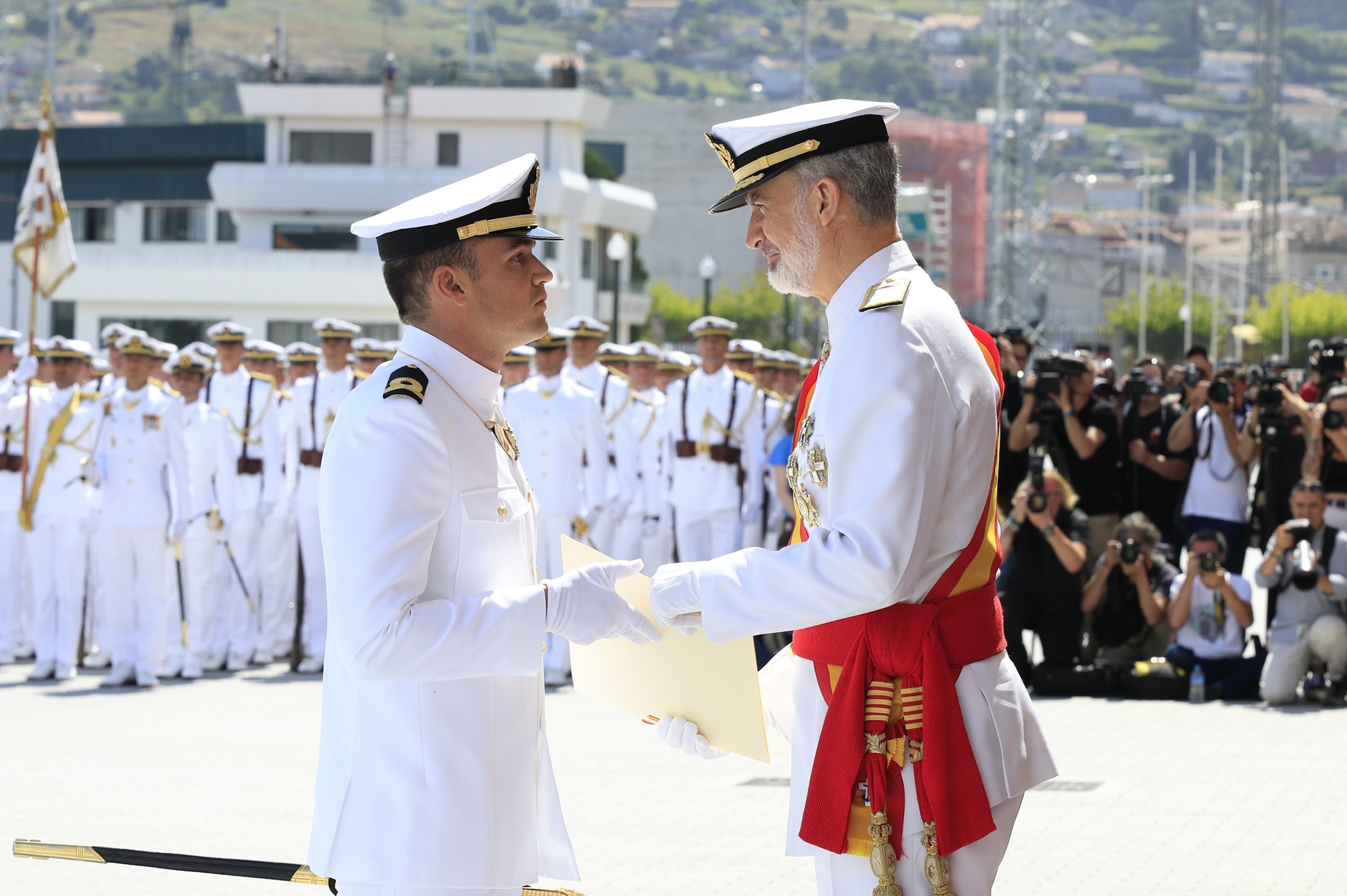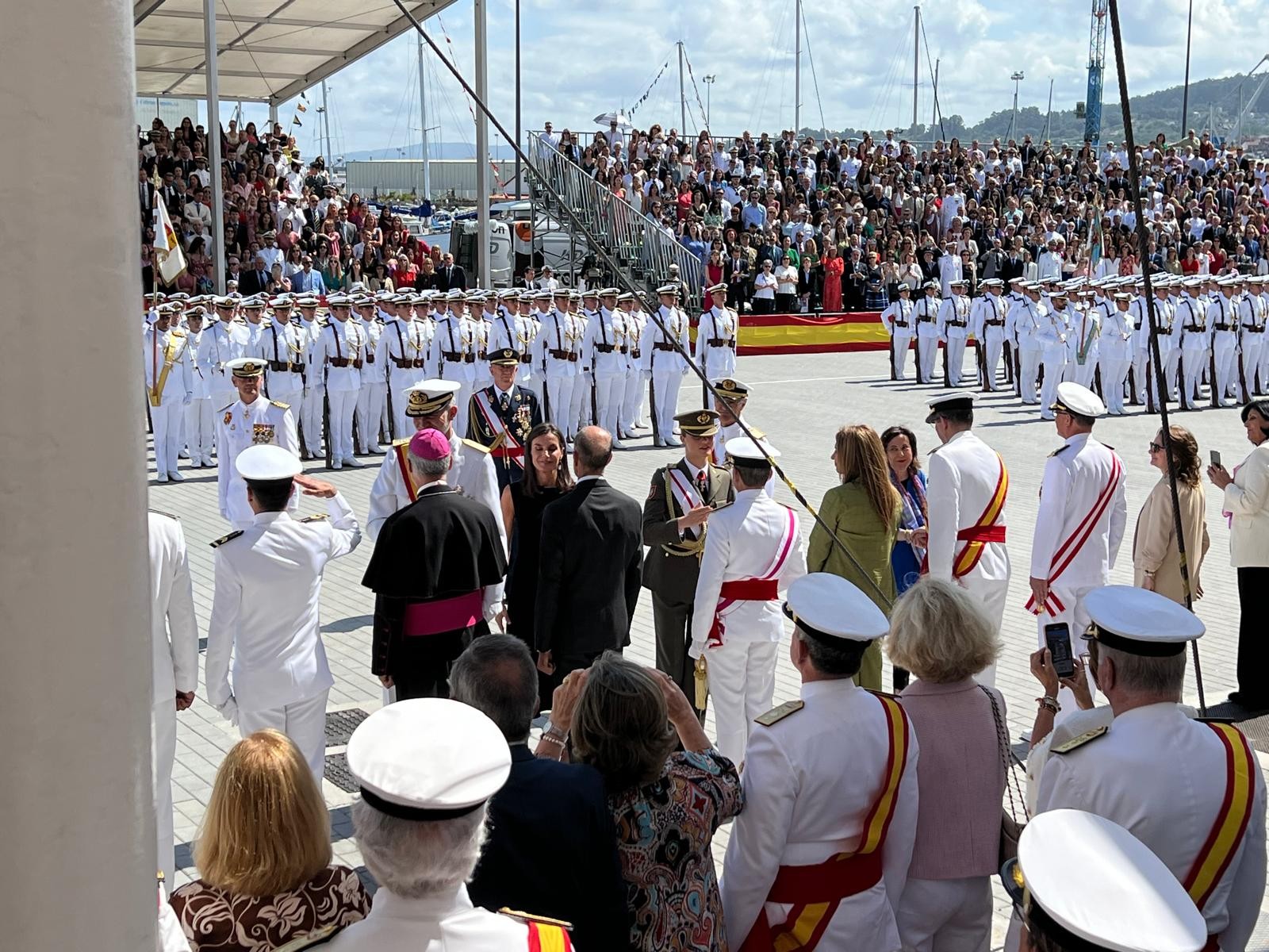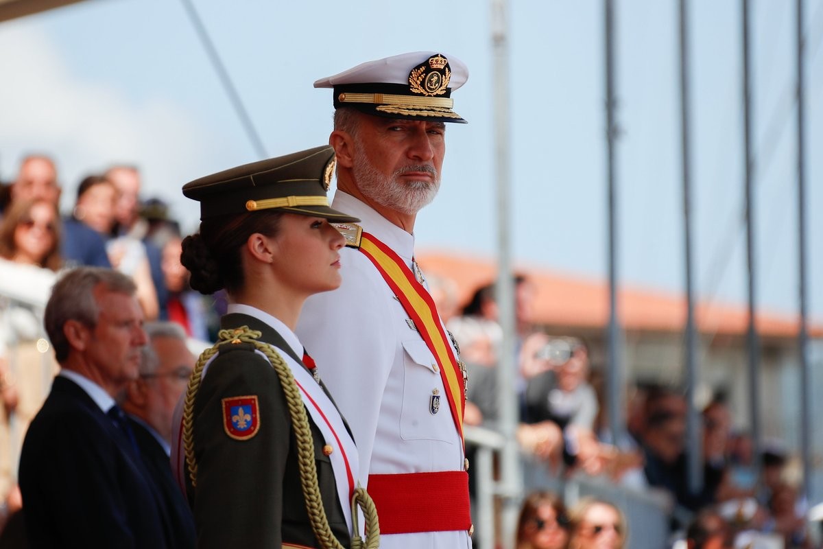 Los Reyes de España y la Princesa de Asturias han presidido el acto de entrega de reales despachos y la jura de bandera de los nuevos guardiamarinas en la Academia Naval Militar de Marín (Pontevedra).