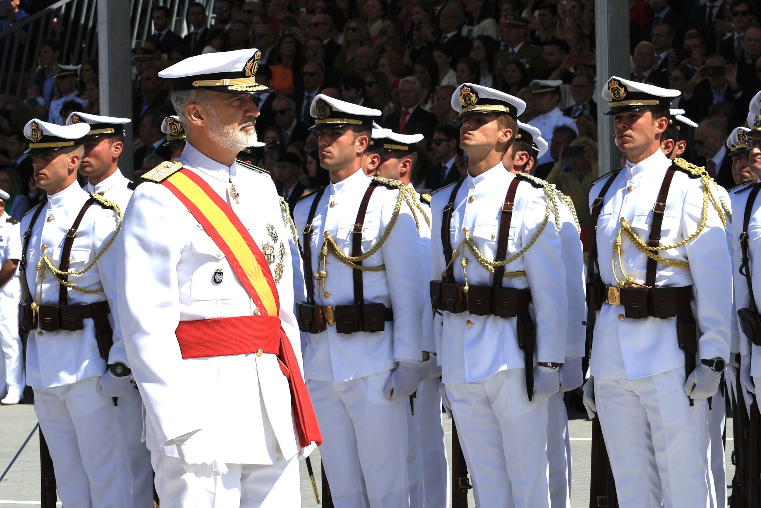El acto ha dado inicio con los compases del himno nacional. Tras esto, el rey Felipe VI ha pasado revista a la fuerza en la Academia Naval Militar de Marín (Pontevedra).
